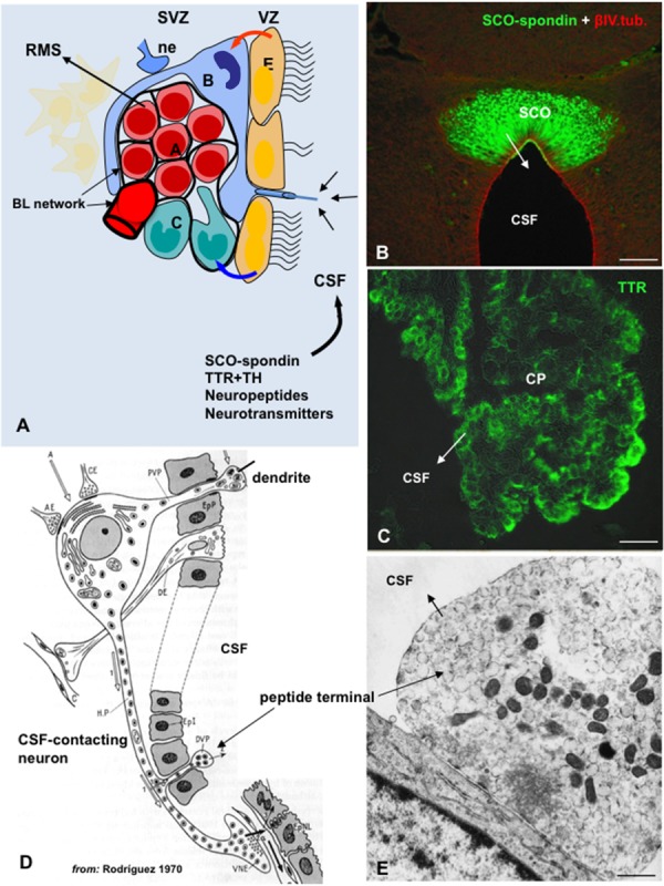 FIGURE 4. The cerebrospinal fluid is a pathway for the delivery of neurotropic factors to the adult SVZ niche. (A) Cell organization of SVZ niche in the adult brain. SVZ astrocytes (B, blue) are stem cells which generate migrating neuroblasts (A, red) destined for the olfactory bulb via rapidly dividing transit-amplifying cells (C, green). A specialized basal lamina (BL, black) extends from perivascular cells and contacts all cell types, including multiciliated ependyma cells (E, orange). Ependymal cells, neural terminals (ne), the extracellular matrix (ECM)-basal lamina (BL) network, and the cerebrospinal fluid (CSF) are key components of the niche and regulator of the adult neurogenesis. Stem cells display a single 9+0 cilium to sensor CSF signals. Compounds secreted into the CSF by circumventricular organs such as the subcommissural organ (SCO) and choroid plexus (CP), or by CSF-contacting neurons can readily reach the SVZ (modified after Riquelme et al., 2008). (B) Frontal section of the rat SCO immunostained with antibodies against SCO-spondin and βIV-tubulin (from Ortloff et al., 2013). (C) Choroid plexus immunostained for TTR. (D) Drawing depicting a hypothalamic peptidergic CSF-contacting neuron with a dendrite projecting to the ventricle bearing a 9+0 cilium, and axon projecting to the capillaries of the pituitary gland and bearing and axonal branch reaching the ventricle (from RodrÃguez, 1976). (E) Electron microscopy of a peptide terminal within the ventricle, with neurosecretory granules undergoing exocytosis. Scale bars: (B) 120 μm; (C) 35 μm; (E) 700 nm. |