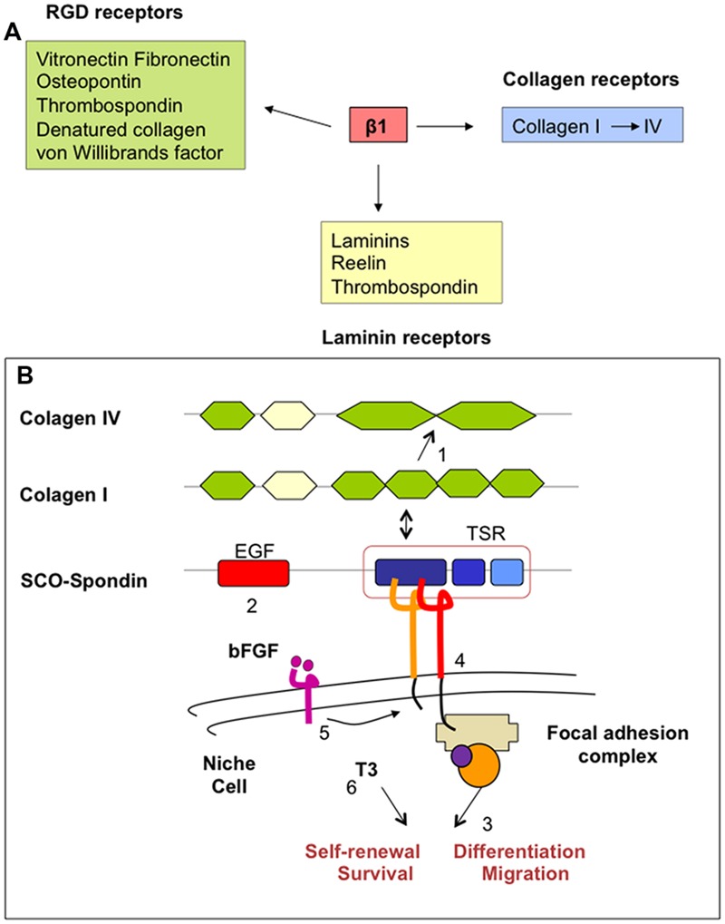 FIGURE 6. (A) Ligands for integrin-β1 heterodimers. Many of these ligands are components of ECM. (B) Simplified schematic drawing of how SCO-spondin might promote neurogenesis in the adult SZV niche. SCO-spondin (1) may change the composition of ECM (i.e., transforming the type of collagen) and (2) the availability of growth factors in the niche, modifying (3) the immediate microenvironment and behavior of niche cells. Some of these functions could be mediated (4) by interaction of SCO-spondin with integrin-β1 signaling and (5) cross talking with other essential pathways, like those regulated by bFGF and TTR/thyroid hormones (6). |