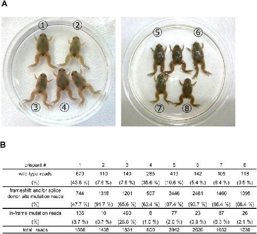 Fig. 2. Amplicon sequencing analysis of on-target sites in trβ crispants. (A) Image of trβ crispants at stage 66. Genomic DNA was extracted from whole bodies of eight trβ crispants and the sgRNA target region was PCR-amplified using barcoded primers. PCR amplicons were subjected to amplicon sequencing according to Materials and Methods. Numbers indicate each crispant that was analyzed by amplicon sequencing in B. (B) The results of wild-type and mutant allele reads in each trβ crispant. All sequenced reads were classified into three groups; wild-type reads, frameshift and/or splice donor site mutation reads, in-frame mutation reads.