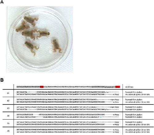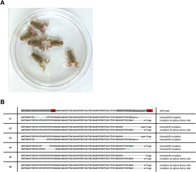 Fig. 6. F1 trβ mutants accomplish natural metamorphosis. (A) Image of F1 offspring produced by mating of the F0 crispants. (B) Mutation sequences from each F1 offspring. PCR products of trβ target site from six F1 froglets were subcloned and sequenced. Sequences highlighted in red and gray denote protospacer adjacent motif (PAM) and protospacer sequence, respectively. Splice donor site is underlined. The deleted and inserted nucleotides are shown by dashes and blue letters, respectively. Capital and small letters indicate exon and intron, respectively.