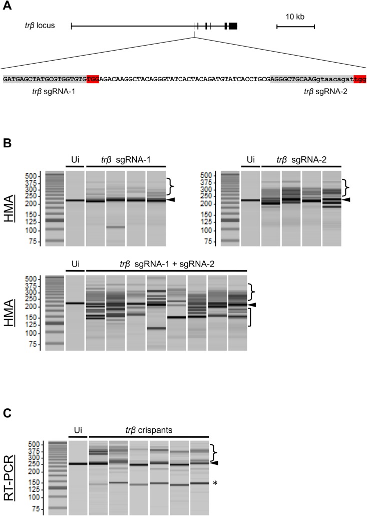 Fig. 1. trβ sgRNA/Cas9 RNP leads to trβ gene disruption in X. tropicalis founders. (A) Schematic illustration of the sgRNA targeting sequences on the 2nd exon and 2nd intron of the trβ gene in X. tropicalis. One of the sgRNAs was designed in the coding region (trβ sgRNA-1) and the other was designed across the exon-intron junction (trβ sgRNA-2). Highlights in red and gray denote the protospacer adjacent motif (PAM) and the 20 bp target sequences of sgRNA, respectively. Exon and intron sequences are indicated by capital and small letters, respectively. (B) Genotyping by HMA in uninjected and injected embryos. PCR products encompassing sgRNA target sites were analyzed using a microchip electrophoresis system. Heteroduplex bands and multiple short bands are shown in the sgRNA/Cas9 RNP-injected embryos (crispants). Arrowheads, wild-type original bands; curly brackets, up-shifted heteroduplex bands; square brackets, deleted bands. (C) RT-PCR was performed using total RNA from stage 61/62 tadpoles with primers designed upstream and downstream of the 2nd exon. In addition to the original band (arrowhead), about 101 bp deleted bands were detected in crispants caused by skipping of the 2nd exon (asterisk) in trβ crispants. Heteroduplex bands were also detected in crispants (brackets). Each lane represents an individual animal. Ui, uninjected control.