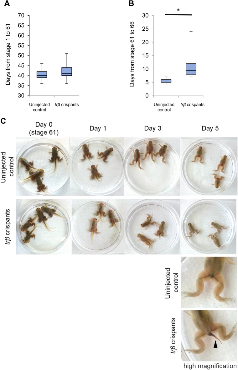 Fig. 5. Delay of tail resorption in trβ crispants during natural metamorphosis. (A) The days from fertilization to stage 61 are indicated in a box plot for uninjected control tadpoles (n=46) and trβ crispants (n=39). There were no significant differences. (B) The days from stage 61 to stage 66 are indicated in a box plot for uninjected control tadpoles (n=45) and trβ crispants (n=38). trβ crispants required significantly more days to reach stage 66 (Welch's t-test, *P<0.05). N values represent the merged total numbers of tadpoles from two independent experiments. Box and whiskers show the interquartile range and maximum and minimum data points, respectively. (C) Time course of tail resorption in uninjected control tadpoles and trβ crispants. Uninjected control tadpoles and trβ crispants of the same age were selected from the same clutch at stage 61 and gill resorption observed at 1 days, 3 days, and 5 days after stage 61 (day 0). Uninjected control tadpoles completed tail resorption by day 5. In contrast, the tail remained in trβ crispants on day 5 (an arrowhead in the high magnification image) and a longer time was required to reach the end of metamorphosis.