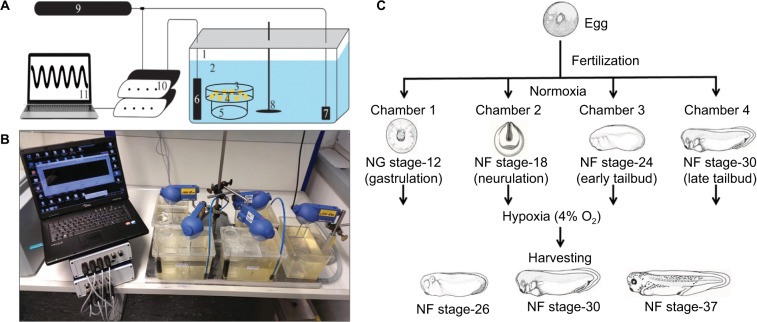 Figure 1. Experimental setup.Notes: (A) Schematic representation of hypoxia chamber setup. 1, plastic chamber; 2, 0.1Ã MBS buffer; 3, 10 cm Petri dish; 4, embryos; 5, glass beaker; 6, oxygen probe; 7, air-stone; 8, stirrer; 9, nitrogen gas supply; 10, OXYREG device; 11, computer. (B) Running hypoxia experiment. Four hypoxia chambers were regulated at 4% oxygen along with a normoxia chamber. Temperatures in the chambers were maintained with the help of thermostat placed below the chambers. Regulation was computer controlled. (C) Growing embryos in hypoxia starting at various developmentally sensitive stages. Embryos were placed in hypoxia chambers at gastrulation, neurulation, and tailbud stages and harvested at a later point during development for assessment.Abbreviation: MBS, Modified Barth's Solution.