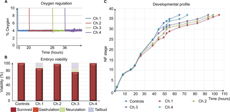 The formation of a functional cardiovascular system is an essential step in the early vertebrate embryo. Nevertheless, the effect of hypoxia on the developmental program of organisms was studied rarely. In particular, this holds true for vertebrate embryos that depend on a functional placenta for proper development and had not been studied in this respect due to the obvious limitation. We established a protocol to culture aquatic embryos, which enabled us to culture a high number of Xenopus embryos until tadpole stage under defined hypoxic conditions in four hypoxia chambers simultaneously, employing a computerized system. In general, our results show that hypoxia results in delayed development and, in particular, we could show that oxygen availability was most crucial during gastrulation and organogenesis (early tailbud) phases during embryonic development of Xenopus laevis.