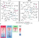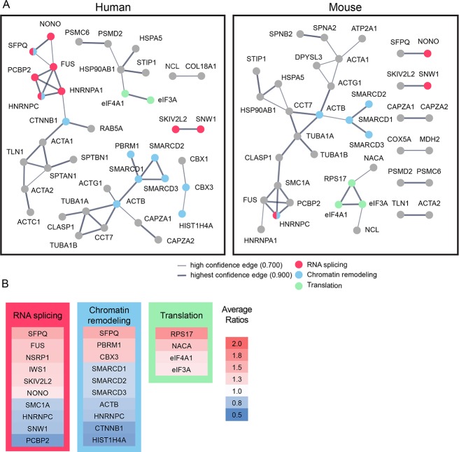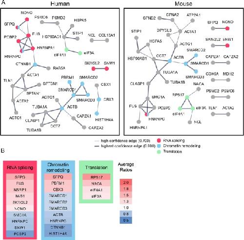 Figure 3. Bioinformatic analysis indicates that candidate plasticity proteins are enriched in processes related to protein translation, RNA splicing and chromatin remodeling.(A) Functional protein interaction networks of CPPs, shown as dots. Lines connecting CPP nodes represent protein interactions reported in the human (left) or mouse (right) STRING databases, with higher interaction confidence represented by thicker lines. CPPs belonging to the top biological processes in each network are color-coded: RNA splicing (red); chromatin remodeling (blue); and translation (green). (B) Fold changes in synthesis of all CPPs pertaining to RNA splicing, translation and chromatin remodeling, not restricted to those within the networks identified by STRING in (A), are color coded by average fold increase or decrease compared to control from 0.5 (blue) to 2.0 (red), indicated at the right. See also Supplementary file 4, which shows that pathways involved in RNA splicing and chromatin remodeling are statistically enriched for CPPs.10.7554/eLife.33420.009Figure 3—source data 1. Values of the fold changes in synthesis of all CPPs presented in Figure 3B. |
