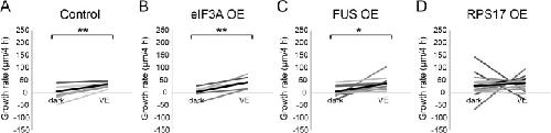 Figure 4âfigure supplement 1. Newly synthesized FUS is required for visual experience-dependent structural plasticity.(AâD) To test the effect of overexpression of CPPs on structural plasticity in response to VE, tecta were electroporated with GFP-expression plasmid 2 days before imaging. GFP-expressing tectal neurons were imaged in vivo before and after 4 hr in dark followed by 4 hr of VE. Dendritic arbors of individual neurons were reconstructed in 3D and total dendritic branch length (TDBL) was compared across imaging time-points for individual neurons. (AâD) Plots of VE-dependent changes in tectal neuron growth rate over 4 hr in dark and VE in tecta electroporated with GFP-expression plasmid (A), GFP and eIF3A-expression plasmid (B), GFP and FUS-expression plasmid (C), or GFP and RPS17-expression plasmid (D). Gray lines connect data points for individual neurons and black lines are the average changes in growth rate in dark and VE. Neurons treated with control GFP-expression plasmid increase growth rate with VE compared to dark. Overexpression of RPS17 blocked the VE-dependent increase in dendritic arbor growth. VE-dependent structural plasticity was unaffected by eIF3A or FUS overexpression. Control: n = 8 cells; eIF3A OE: n = 6 cells; FUS OE: n = 11 cells; RPS17 OE: n = 17 cells. *p<0.05, **p<0.01, Two-tailed paired Studentâs t test were used to compare between two matched pairs. |