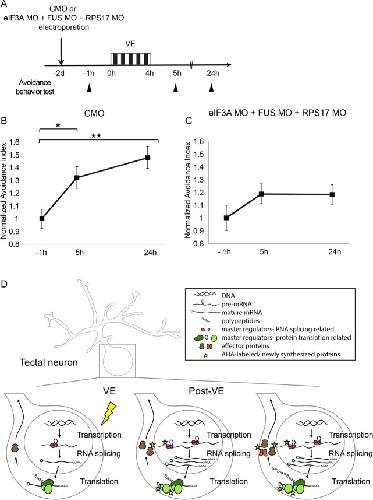 Figure 7. Knockdown of eIF3A, RPS17, and FUS blocks visual experience-dependent behavioral plasticity.(A) Protocol to evaluate the effect of eIF3A, FUS, and RPS17 knockdown on visual avoidance behavior. Tecta were electroporated with control MO or eIF3A MO + RPS17 MO + FUS MO and 2 days later were assayed for baseline visual avoidance behavior at −1 hr, exposed to VE for 4 hr and assayed for visual avoidance behavior 5 hr and 24 hr after the onset of VE. (B) VE-induced behavioral plasticity in control animals was detected at 5 hr and maintained at 24 hr. (C) Triple knockdown blocked behavioral plasticity. AI values were normalized to baseline at −1 hr (B–C). (B–C) CMO: AI = 1 ± 0.07, 1.32 ± 0.09, or 1.48 ± 0.09; n = 21, 27, or 31 animals for tests at −1 hr, 5 hr, or 24 hr; eIF3A MO + RPS17 MO + FUS MO: AI = 1 ± 0.10, 1.19 ± 0.08, or 1.18 ± 0.08; n = 22, 33, or 33 animals for tests at −1 hr, 5 hr, or 24 hr. *=p < 0.05, **=p < 0.01, the Steel-Dwass test was used for nonparametric multiple comparisons with control. Error bars represent ±SEM. (D) Schematic of visual experience-induced dynamics in protein synthesis machinery. By combining BONCAT and DiDBiT, we identified CPPs including master regulators that control gene expression or protein translation, such as eIF3A, FUS, and RPS17, and effector proteins that maintain plasticity in response to VE, such as cytoskeletal proteins. Functional analysis of select CPPs suggests that de novo synthesis of master regulators is required for experience-dependent plasticity. Our data suggest that the experience-dependent changes in the nascent proteome result from a combination of direct changes in synthesis of master regulators and effector proteins, and secondary effects downstream of differential synthesis of master regulators.10.7554/eLife.33420.021Figure 7—source data 1. Quantification of normalized AI values data presented in Figure 7B–C. |
