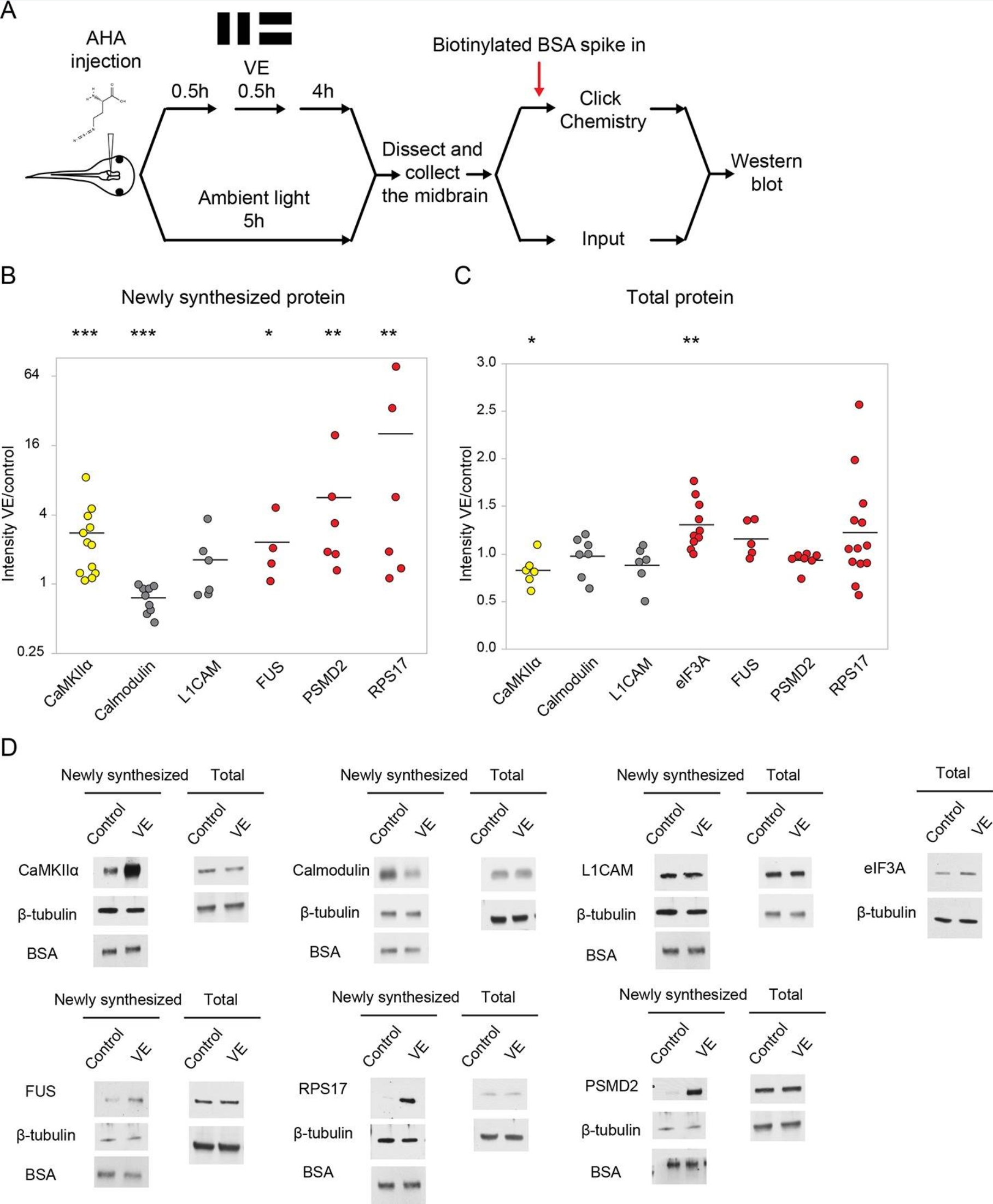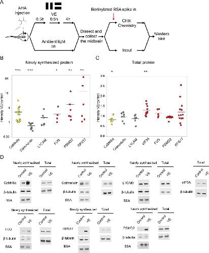 Figure 2. Validation of visual experience-dependent changes in CPP synthesis.(A) Protocol to prepare AHA-labeled samples. Tissue was processed to tag AHA-labeled proteins from VE-treated and control samples with biotin using click chemistry followed by western blot analysis. (B, C) Scatter plots of western blot data of newly synthesized (B) or total (C) CPPs and non-CPPs. Data are presented as ratios of intensities for paired VE and control samples. αCaMKII (yellow) is a positive control. WBs of CPPs (red) corroborated the proteomic results. For non-CPPs (gray), L1CAM NSPs increased and decreased in western blot and proteomic data, while calmodulin NSPs consistently decreased in western blot data, but increased and decreased in proteomic data (Supplementary file 2). (D) Representative images of western blots of newly synthesized or total CPPs and non-CPPs. The Y axis of B is plotted in a log scale and the Y axis of C is plotted in a linear scale. *p<0.05, **p<0.01, ***p<0.001, two-tailed Studentâs t test (C) or Mann-Whitney test (B) was used to compare between paired samples from control and VE treatments. n â¥Â 4 independent experiments for each CPP. The black bars represent the mean. |