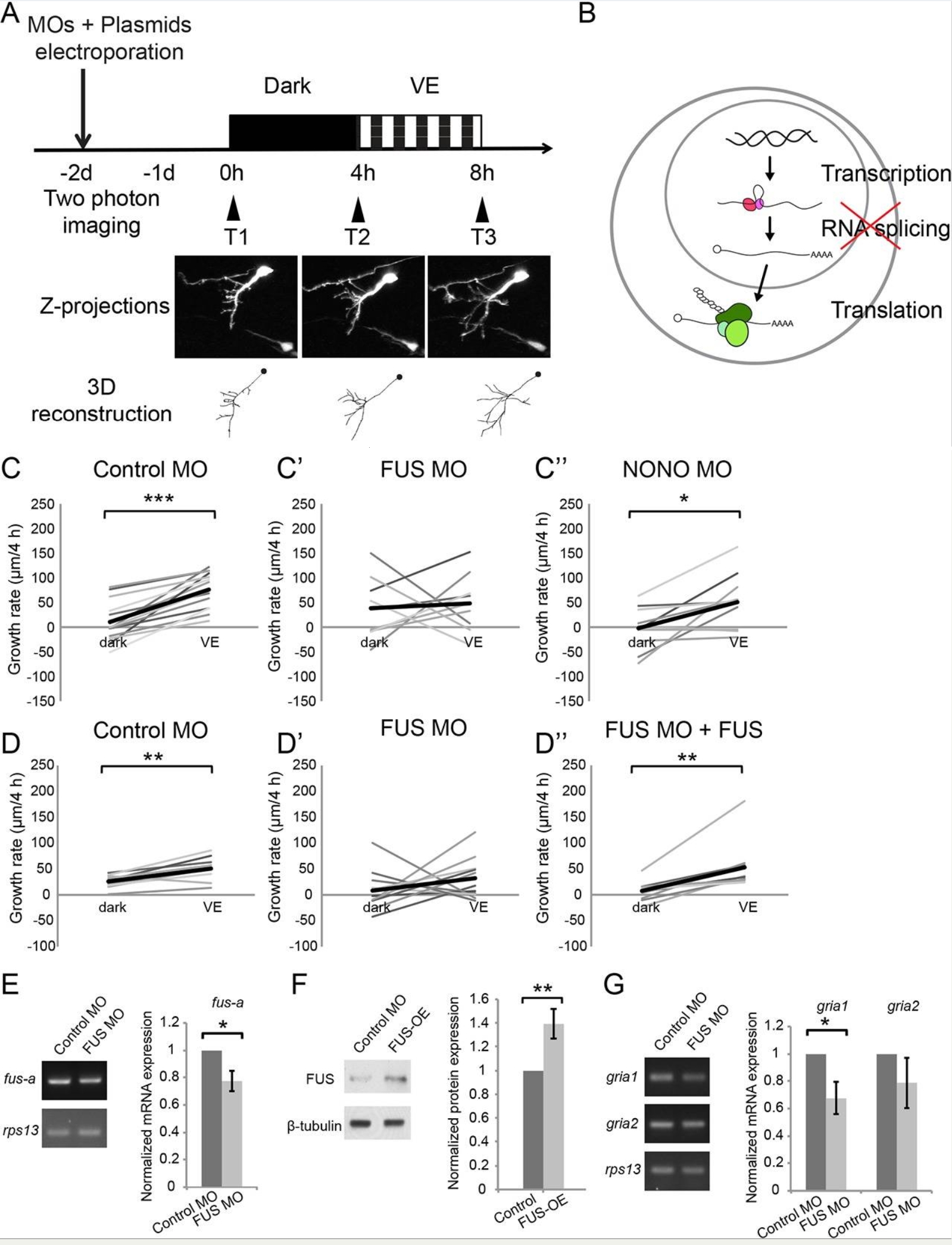 Figure 4. Newly synthesized FUS is required for visual experience-dependent structural plasticity.(A) Protocol to test the effect of MO-mediated CPP knockdown on VE-dependent structural plasticity. Tecta were co-electroporated with MOs and GFP-expression plasmid 2 days before imaging. GFP-expressing tectal neurons were imaged in vivo before and after 4 hr in dark followed by 4 hr of VE. Images of a control neuron are shown. Dendritic arbors of individual neurons were reconstructed and total dendritic branch length (TDBL) was compared across imaging time-points. (B) A schematic of different regulatory steps of gene and protein expression, including nuclear transcription, RNA splicing, and cytosolic translation. (CâCââ) Plots of VE-dependent growth rates (changes in TDBL over 4 hr) in dark and VE in tecta electroporated with control MO (C), FUS MO (Câ), or NONO MO (Cââ). Gray lines connect data points for individual neurons and black lines are average growth rates in dark and VE. Neurons treated with control MO increase growth rate with VE compared to dark. FUS MO blocked the normal increase in growth rate in response to VE. VE-dependent structural plasticity was unaffected by NONO MO. Control MO: n = 14 cells; FUS MO: n = 9 cells; NONO MO: n = 10 cells. (DâDââ) The impaired experience-dependent structural plasticity seen with FUS knockdown (Dâ) was rescued by expression of exogenous FUS (Dââ). Control MO: n = 9 cells; FUS MO: n = 11 cells; FUS MO + FUS: n = 10 cells. (E, F) Validation of FUS knockdown and overexpression (OE). Normalized mRNA or protein expression of fus/FUS in tecta electroporated with FUS MO (E) or FUS expression construct (F), compared to controls. (E) Left: Representative gels of fus-a and control rps13 transcripts from tecta electroporated with control or FUS MO. Right: fus-a expression normalized to rps13 from tecta treated with control or FUS MO. FUS knockdown significantly reduced fus-a (0.78 ± 0.08, p=0.0302), n = 4 independent experiments. (F) Left. Representative blots of FUS and β-tubulin expression from tecta electroporated with control or FUS expression construct. Right: FUS expression normalized to β-tubulin from tecta treated with control or FUS expression constructs. FUS expression construct significantly increased FUS protein. FUS-OE: 1.4 ± 0.13, p=0.0172; n = 5 independent experiments. (G) Left: Representative gels of gria1 and gria2 and control rps13 transcripts from tecta electroporated with control MO or FUS MO. Right: plots of gria1 and gria2 expression normalized to rps13 from tecta treated with control or FUS MO. Fus MO significantly decreased gria1 (0.68 ± 0.12, p=0.0365) but not gria2 (0.79 ± 0.18, p=0.1642); n = 4 independent experiments. *p<0.05, **p<0.01, ***p<0.001, two-tailed paired Studentâs t test for comparisons between two matched pairs (CâD) and one-tailed Studentâs t test for comparisons of two independent groups (EâG). Error bars represent ±SEM (EâG). |