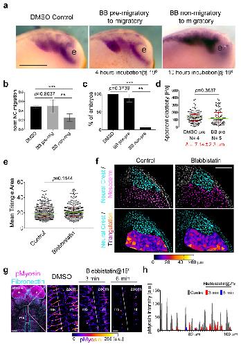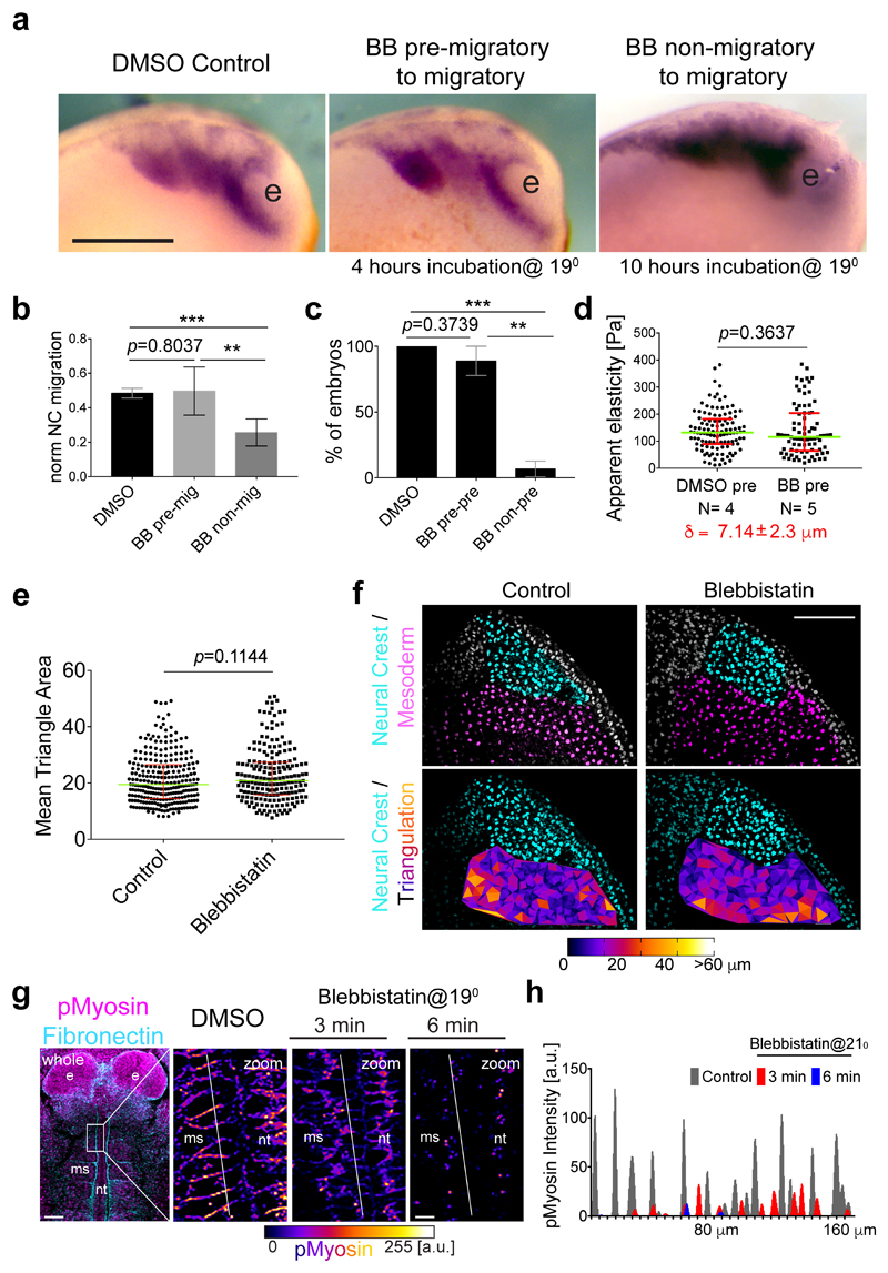 d represent medians and SD respectively (one-way ANOVA P <0.0001, two-tailed t-test **P<0.008, ***P<0.002, CI= 95%, N= 19 animals). (d) iAFM measurement direct on mesoderm; Spread of data plotted for each condition, green lines represent median, red whiskers the interquartile range (two-tailed Mann–Whitney test, p value as indicated, CI= 95%, n= number of AFM-indentations, nDMSO= 116, nBB_pre= 204, N= number of animals, δ= averaged maximum indentation depth). (e–f) As blebbistatin treatment could affect cell-cell adhesion promoting cell dispersion, we measured its effect on cell dispersion by calculating the distance between neighbor mesoderm cells. (e) Chart comparing the mean area of the triangle formed by each mesoderm cell with its neighbours, calculated by Delaunay triangulation (Mann Whitney test p value as shown). (f) Images showing neural crest and mesoderm cells (treated as indicated) and triangles from which the areas were calculated. Scale bar 200 μm (g) Immunostaining for phospho-Myosin (pMyosin), dorsal view of a flat-mounted embryo and color-coded intensity of zoom images at the indicated time points are shown (scale in arbitrary units). (h) Fluorescence intensity in arbitrary units [a.u.] across the white line in the zoom panels. All experiments repeated at least three times. a,f,g are representative examples of 3 independent experiments. Scale bars (b) 150 μm, (e, whole) 100 μm, (e, zoom) 15 μm. ms, mesoderm; nt, notochord; e, eye. |