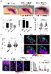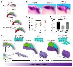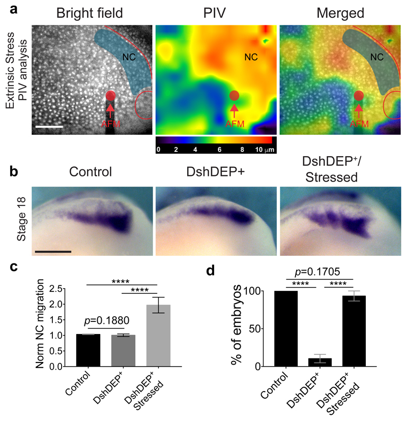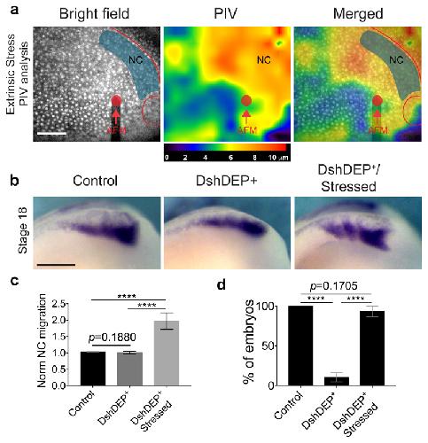 Extended Data Figure 10. Extrinsic compression modifies the environment of PCP depleted embryos and triggers premature neural crest collective migration, in vivo.(a), Magnitude maps from a particle image velocity (PIV) analysis presented to facilitate the visualisation of the x/y extent of the stress field generated by the extrinsic compression experiment (scale bar in microns). Neural plate border shown in red lines, neural crest in light blue. (b–c) Extrinsic stress-induced premature NC migration. (b) Lateral views of embryos hybridised with a probe against snail2, notice NC premature migration is observed in the DshDEP+/Stressed panel. (c) Normalised NC migration and (d) percentage of embryos displaying each phenotype are shown. Histograms and bars represent media and SD, (one-way ANOVA P <0.0001, two-tailed t-test ****P<0.0001, CI= 95%, N= 18 animals). Images in a and b are representative examples of 3 independent experiments. Scale bars (a) 200 μm, (b) 150 μm. |