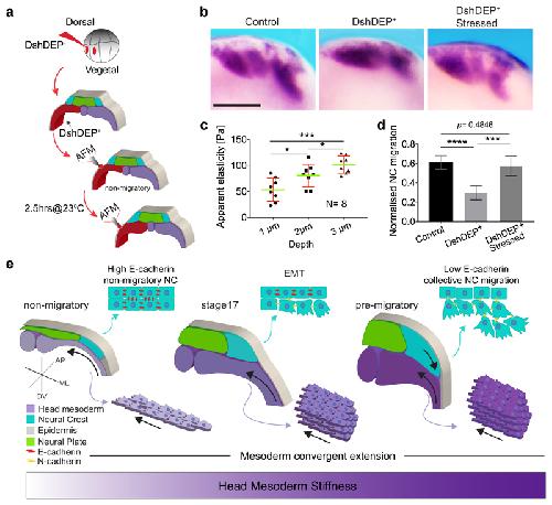 Figure 4. PCP loss-of-function is mechanically rescued by extrinsically inducing mesodermal stiffening.(a–d) Mechanical rescue of DshDEP+ induced defects. (a) Graphic description of compression experiments. (b) Lateral view of snail2-hybridised embryos. (c) Induced apparent elasticity plotted as a function of indentation depth, Nc= 8 animals, green lines represent median and whiskers show the spread of data (excluding outliers). (d) Normalised NC migration, N= 19 animals. b,d representative examples from three independent experiments. Histograms in c, d represent media and error bars SD (one-way ANOVA P <0.0003; two-tailed t–test *P<0.045, ***P<0.0002, ****P<0.0001, CI= 95%, δ = average indentation depth. Scale bars (b) 200 μm. (e) Schematic representing how mechanical interaction between mesoderm and NC coordinates morphogenesis. As convergent extension progress, the mesoderm stiffens, and in turns, NC epithelial-to-mesenchymal transition (EMT) is triggered and CCM proceed (AP, anteroposterior; ML, mediolateral; DV dorsoventral). NC, Neural crest. |