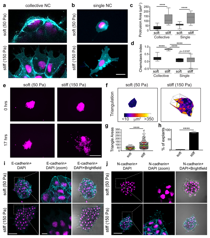 Extended Data Figure 3. Neural crest motility, dispersion, and EMT are controlled by substrate mechanics.(a–d) Protrusion and chemotaxis analysis of collective and single NC cells plated on soft and stiff substrates. (a) Confocal projections of labelled NC collectives plated on soft or stiff gels. (b) Confocal projections of labelled single NC cells plated on soft or stiff gels. (c) Protrusion area and (d) chemotaxis quantifications for collective and single NC cells plated on soft or stiff gels, boxes show the 25th, median, and 75th percentiles; whiskers show the spread of data (excluding outliers) Nprotrusion_area= 63 cells, Nchemotaxis= 79 cells (one-way ANOVA P <0.0001, two-tailed t-test ****P<0.0001, CI= 95%). (e–h) NC dispersion analysis on gels of varying stiffness. (e) NC cells labelled with nRFP and plated on stiff or soft gels are shown at 0 and 17 hours after plating. (f–h) quantification of cell dispersion. (f) Color-coded Delaunay triangulation shown at 17 hours after plating to facilitate visualization of the distances between neighbor cells. (g) Quantification of Delaunay triangulation, spread of data for each condition is plotted, green lines represent median, red whiskers the interquartile range (two-tailed Mann–Whitney, ****P<0.0001, CI= 95%, Ng= 730 triangles from 31 explants. (h) percentage of dispersing explants, histograms represent media and error bars s.e.m. (two-tailed t-test ****P<0.0001, CI= 95%, Nh= 31 explants) g and h, are data from 4 independent experiments (soft) and 3 independent experiments (stiff). (I,j) Immunostaining for (i) E-cadherin and (j) N-cadherin on NC plated on substrates of varying stiffnesses. a–b,e,i,j representative examples of 3 independent experiments. Scale bars (a,b) 20 μm, (e) 250 μm, (I,j) 50 μm, (I,j, zoom) 10 μm. |