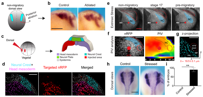 Extended Data Figure 4. Posterior ablations, mesoderm targeted injections, and extrinsic compression characterisation.(a–b) Ablation controls. Mechanical tension in Xenopus is higher in the anterior region of the embryo than in posterior territories12,41. Consistent with this observation, no effect on NC migration or tissue stiffness was observed when the ablation was done in posterior regions. (a) Schematic showing embryos ablated at non-migratory stages, and NC migration at stage 23 (migratory)7. (b) Lateral views of Control and posteriorly ablated embryos hybridised with a probe against snail2. (c–d) Targeted injections to the head mesoderm. (c) Cartoon shows that injecting 2 dorso-vegetal blastomeres targets the head mesoderm. (d) Confocal images of targeted injections showing nuclear RFP expression in the mesoderm, panels as labelled in the figure. Scale bars (b) 250 μm, (d) 100 μm. (e–g) Compression controls. (e) Images of embryos being compressed from non- to pre-migratory stages with a 90-micron diameter bead attached to an AFM cantilever (bead, red circumference), neural plate border highlighted with red lines and NC position shown in light-blue, stages as labelled. (f) Magnitude maps from a particle image velocity (PIV) analysis indicates the x/y extent of the deformation induced by AFM indentation. (g) Maximum projection of a cross-section showing the z-deformation generated by the AFM compression, epidermis (ep) and mesoderm (ms) are being deformed, averaged maximum indentation depth (δ) is provided (nuclei are visible in the bead region due to a maximum projection effect). (h,i) Result of extrinsic stress experiments. (h) Dorsal view (anterior to top) of embryos hybridised with a probe against snail2, black arrows point to migrating NC. (i) Percentage of embryos displaying NC migration, histograms represent media, error bars s.e.m. N= 13 animals (two-tailed t-test **P=0.0010, CI= 95%). All experiments repeated three times. Scale bars (e, f) 200 μm, (g) 100 μm, (h) 200 μm. |