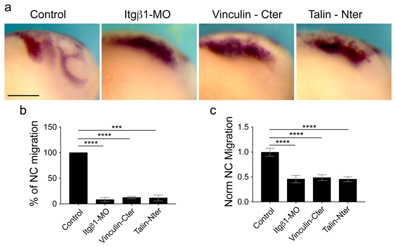 Extended Data Figure 7. NC senses mesoderm stiffening by using an Integrin/Vinculin/Talin-mediated mechanoresponsive mechanism.(a–c) Analysis of NC migration after Integrin-β1, Vinculin or Talin knockdown. (a) Lateral views of embryos hybridised with a probe against snail2. Control embryos migrate normally from dorsal to ventral. However, NC migration is drastically inhibited in embryos treated with Itgβ1-MO or the negative dominants Vinculin-Cter or Talin-Nter. Embryos in a are representative examples of 3 independent experiments. (b–c) quantification of neural crest migration showing (b) percentage of embryos and (c) normalised NC migrated distances. Histograms represent media, error bars SD. (one-way ANOVA P <0.0001, two-tailed t-test ***P<0.0002 ****P<0.0001, CI= 95%). N= 39 embryos. Scale bar 200 μm. |