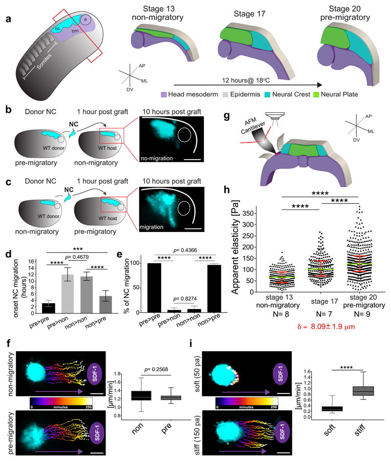 Figure 1. Changes in environmental stiffness are required for neural crest collective migration.(a) Schematic cross-sections of NC development (AP, anteroposterior; ML, mediolateral; DV dorsoventral). Cephalic NC originates from ectoderm at the border of the neural plate and undergoes EMT before migrating by using head mesoderm as substrate. (b–e) Heterochronic grafts. (b) Labelled pre-migratory NC (cyan) grafted into non-migratory hosts, a representative example of ‘not-migrating’ NC at 10 hours post graft is shown. (c) Non-migratory NC (cyan) grafted into pre-migratory hosts, a representative example of ‘migrating’ NC at 10 hours post graft is shown. (d) Onset of NC migration. (e) Percentage of migrating NC at 10 hours post graft. Histograms represent media, error bars (d) SD, (e) s.e.m (one-way ANOVA P<0.0001; two-tailed t-test ***P<0.0002, ****P<0.0001, CI= 95%, Nb,c,d,e = 43 animals). (f, i) Time colour-coded trajectories and speed quantification of NC migrating towards Sdf-1. (f) Non-migratory versus pre-migratory NC. (i) pre-migratory NC plated on soft or stiff substrates. Boxes in f,I represent 25th, median and 75th percentiles, whiskers show spread of data (two-tailed t-test, ****P<0.0001, Nf= 78 cells; Ni= 79 cells). (g–h)