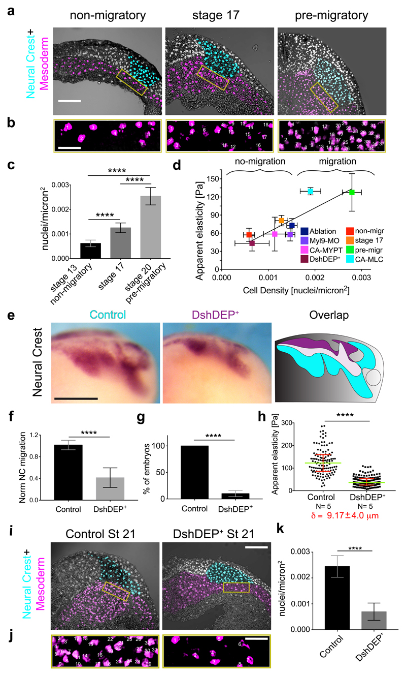 Figure 3. PCP-dependent convergent extension is the driving force for mesodermal stiffening.(a–d) Cell density analysis. (a) Cross-sections of embryos at the indicated stages showing embryo morphology and pseudo-stained nuclei for NC (cyan) and mesoderm (magenta). (b) Magnification of the area used to quantify cell density. (c) Nuclei density under the NC (N= 27 sections). (d) Head mesoderm apparent elasticity as a function of cell density (Pearson test R= 0.8627, N= 16 animals). (e–k) Effect of DshDEP+. (e) Lateral views and overlaps of Control (cyan) or DshDEP+ (magenta) snail2-hybridised embryos. (f) Normalised NC migration (N=14 animals), (g) Percentage of embryos. (h) iAFM measurement direct on mesoderm; spread of data, green lines represent median, red whiskers interquartile range (two-tailed Mann–Whitney, ****P<0.0001, CI= 95%, ncontrol= 120, nDshDEP+= 148, N= number of animals, δ= averaged maximum indentation depth). (i) Overlay showing embryo morphology and nuclei. (j) Magnification showing the area used to quantify cell density. (k) Nuclei density under the NC, (N= 11 animals). Histograms in c, f, g, k represent media, error bars SD, or s.e.m in g (one-way ANOVA P <0.0001; two-tailed t-test ****P<0.0001, CI= 95%). Scale bars (a, b, i, j) 100 μm, (e) 200 μm. a,e,c,f,g,k representative examples from three independent experiments. |