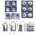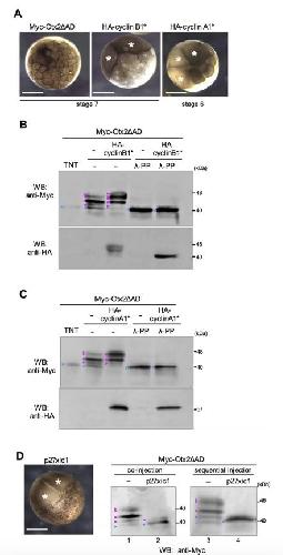 Fig. 2. Cdk-dependent phosphorylation of Otx2. (A) Cleavage arrest by HAcyclin B1* or HA-cyclin A1*. mRNA was injected into one blastomere at the twocell stage, and embryos were observed at the 32-cell (stage 6) or early blastula (stage 7) stage. Animal view. (B,C) Western blotting of Myc-Otx2δAD coexpressed with HA-cyclin B1* (B) or HA-cyclin A1* (C). Lysates were treated with λ-PP as indicated. (D) Phenotype of p27xic1-overexpressing embryos (left) and western blotting of Myc-Otx2δAD co-expressed with p27xic1 (middle, right). Co-injection (middle): Myc-Otx2δAD mRNA (500 pg/embryo) was coinjected with (lane 2) or without (lane 1) p27xic1 mRNA (2 ng/embryo) into one blastomere at the two-cell stage. Sequential injection (right): p27xic1 mRNA (1.5 ng/embryo) was injected into one blastomere at the two-cell stage, then mRNAs for Myc-Otx2δAD (500 pg/embryo) and p27xic1 (500 pg/embryo) were co-injected into the cleavage-arrested blastomeres at the 32-cell-stage equivalent (lane 4). Myc-Otx2δAD mRNA was injected at the two-cell stage as control (lane 3). Lysates were prepared from embryos at stage 8 (B), stage 9 (C and D, lanes 1 and 2) or stage 9.5 (D, lanes 3 and 4). White asterisks indicate cleavage-arrested blastomeres. Scale bars: 500 μm in A and D. |