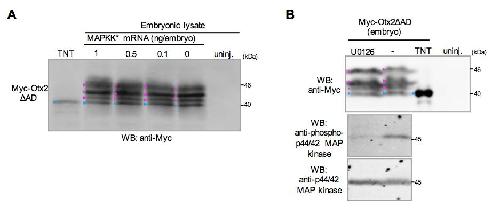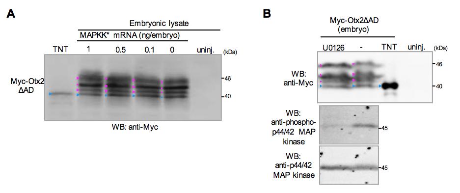 Fig. S4. Effect of MAPK on modifications ofOtx2. (A) No effect of a constitutively active mutant of MAPKK (MAPKK*) on modifications of Otx2. Overexpression of MAPKK* did not apparently affect the modified bands of Myc@Otx2ΔAD even with the high@dose injection of MAPKK *. The amounts of injected MAPKK** mRNA were as indicated. mRNAs were injected into the animal pole region of both blastomeres at the 2@cell stage. (B) No effect of the chemical inhibitor for MEK (MAPKK), U0126, on modifications of Otx2. Myc@Otx2ΔAD expressing embryos were injected with U0126 into the blastocoel at the early blastula (stage 6), and subjected at the gastrula (stage 10.5) to western blotting with anti@Myc, anti@ p44/42 MAP kinase and anti@phospho@p44/42 MAP kinase antibodies as indicated. Blastocoel injection of U0126, which reduced the activation form of MAPK, phospho@ p44/42 MAP kinase (Fig. S4B, middle and bottom panels), did not affect the modified bands of Myc@Otx2ΔAD (upper panel). Blue arrowheads, nascent proteinsY magenta arrowheads, modified proteins. |