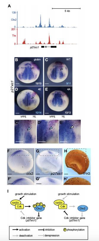 Fig. 6. Phosphomimetic Otx2-4E negatively regulates p27xic1. (A) Genome browser representation showing occupancies of Otx2 and Tle in Xenopus tropicalis gastrula embryos around the p27xic1 gene. (B-E) WISH analysis of p27xic1 at the neurula stage (stages 13-14). mRNA (30 pg/embryo) for globin (B), WT (C), 4E (D) or 4A (E) together with nbgal mRNA was injected in the presumptive posterior neuroectoderm at the four-cell stage. Dorsal view with anterior up. inj. indicates the injected side; uninj. indicates the uninjected side. Colors of numbers and arrowheads are the same as in Fig. 4. (Câ²,Dâ²,Eâ²) Enlarged image of C, D and E (dotted white box). (F-H) WISH and immunostaining of sagittal hemisection. WISH for otx2 and p27xic1 (F,G). Immunostaining of PH3 (H). Dorsal up, anterior to the left. (Fâ²,Gâ²,Hâ²) Enlarged images of F,G, H (dashed gray box). Dashed blue or white lines indicate the position of the blastopore. (I) A schematic model of feedback loops involving Cdk, Otx2 and p27xic in cell-proliferation (left) and non-proliferation states (right). Left, upon growth stimulation, (1) activation of Cdk causes phosphorylation of Otx2; (2) phosphorylated Otx2 downregulates p27xic1; and (3) the reduction in p27xic1 increases Cdk activity, thereby enhancing both cell proliferation and a phosphorylation state of Otx2. Right, upon the reduction of growth stimulation, (1) reduced Cdk activity causes the reduction of phosphorylation of Otx2; (2) the reduction in phosphorylated Otx2 derepresses p27xic1; and (3) increased p27xic1 inhibits Cdk activity, thereby reducing both cell proliferation and a phosphorylation state of Otx2. Scale bars: 300 μm in BH,Câ²-Hâ². |