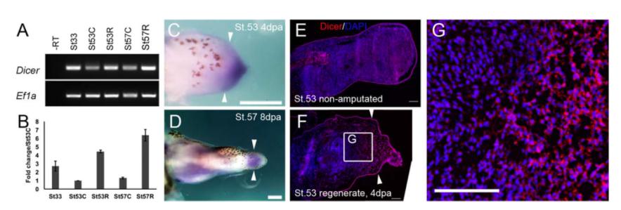 limb, 4 dpa (F). (G) Enlarged view of Dicer expression in the regenerating blastemal. Scale bars: 0.5 mm in (C, D); 0.1 mm in