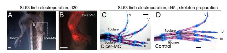 injected limb, 20 days after electroporation. Red fluorescence shows the distribution of Dicer-Mo. Skeletal staining of