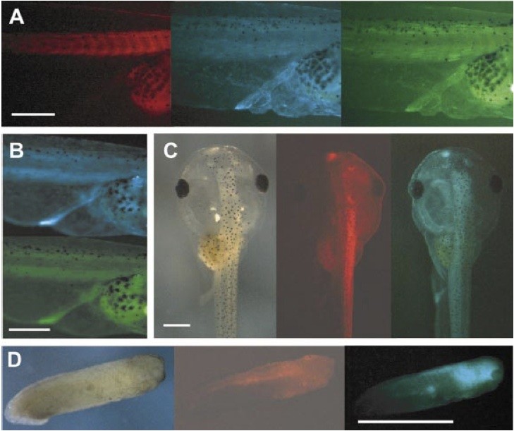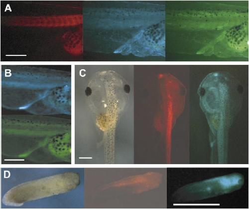 Figure 3. Cre action in F1 larvae of C5 containing EYFP as an activated marker gene. Eggs of female C5 were fertilized with wild-type sperm and injected with a mixture of Cre (one part) and DsRed2 (three parts) mRNA at the two-cell stage. To get a high level of recombination we injected a high amount of Cre mRNA known to interfere with development in the tail bud stage. Injecting 364 two-cell stage embryos we obtained 42 swimming tadpoles (stage 45) (20) expressing the marker DsRed2. Pictures of living larvae are given. (A) Red, blue and yellow ̄uorescence of the lateral view of the middle part of an injected larvae. Twelve tadpoles showed such yellow myotomes. (B) Blue and yellow ̄uorescence of the lateral view of the middle part of an uninjected larvae. (C) Dorsal view of a swimming larvae in normal light as well as in red and blue ̄uorescence. Eight tadpoles showed this phenotype of extinction of blue ̄uorescence in the injected part. (D) Lateral view of a tail budembryo in normal light as well as in red and blue ̄uorescence. This `blue-induction' phenotype was seen in 21 animals from a sample of 30 larvae derived from injected non- ̄uorescent two-cell stage embryos. All these animals died before reaching the swimming tadpole stage. The scale bars are 2 mm.