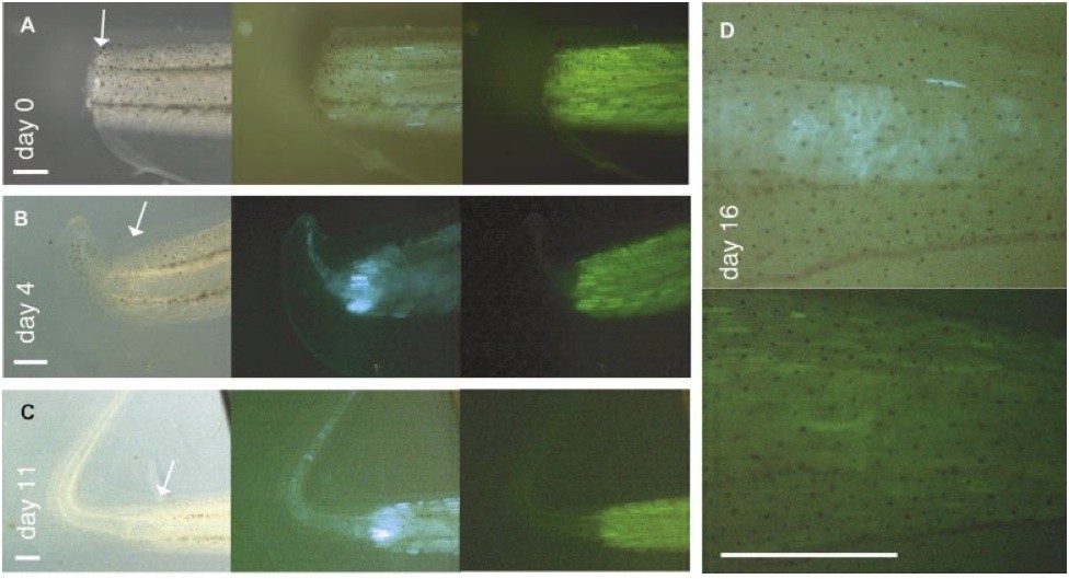 Figure 5. Muscle cell labeling in the regenerating Xenopus tail. Larvae derived from crossings between C5 and A6 that contain yellow muscle were grown up to stage 52 (day 28) and the tail tip was removed (see Fig. 4D). (A�C) Pictures in normal light, blue and yellow ̄uorescence are given at various times after tail removal. The border between the tail stump and the regenerate is marked by an arrow. (D) Close-up of a regenerated tail tip in blue (top) and yellow ̄uorescence (bottom) at day 16. The scale bars are 1 mm.