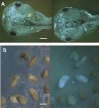 Figure 2. Founder animals at larval stage and F1 embryos. (A) Blue ̄uores- cence of two Xenopus larvae derived from a transgenic reaction with LCMV:ECFP(loxP) (FRT)EYFP. (B) Early tail bud stage embryos derived from the founder female C5 under normal light or blue ̄uorescence show that ~30% of the embryos are blue. The intensity of the blue ̄uorescence in F1 animals differs. The scale bars are 1 mm.
