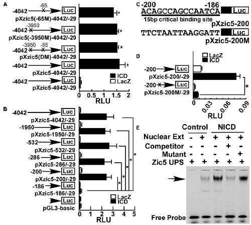 FIGURE 5. Identification of a novel NRE in Xenopus Zic5. (A) A ∼4 kb region (-4042 to -29) upstream of Zic5 contains a Zic5 promoter. Mutations of two putative canonical CSL binding sites within this 4 kb region did not affect notch’s activation of promoter activity. X’s represent the mutated site. (B) Deletion assay of Zic5 upstream regulatory sequence identified a 15 bp NRE locating between -200 and -186 bp in response to NICD activation. P-values relative to -186/-29 fragment are -200/-29 (P = 0.004); -286/-29 (P = 0.015); -533/-29 (P = 0.013); -1950/-29 (P = 0.004); -4042/-29 (P = 0.014). (C) Diagram of the constructs containing 15 bp CSL sequence and mutations in the promoter constructs. pXZic5-200 represents the wild-type and pXZic5-200M represents the 15 bp CBS mutant plasmid. (D) Mutation of the 15 bp CBS (pXZic5-200M) abolished the activation triggered by NICD in the reporter assay; P = 0.0017. (E) EMSA assay; NICD expression increased protein binding to the 15 bp NRE (see section “Materials and Methods”). The number represents Mean ± SEM, N = 3, ∗P < 0.05 with the post hoc Newman–Keuls test. RLU, relative luminant unit; Nuclear Ext, nuclear extraction; Zic5 UPS, fluorescent-labeling zic5 upstream Notch response element. |