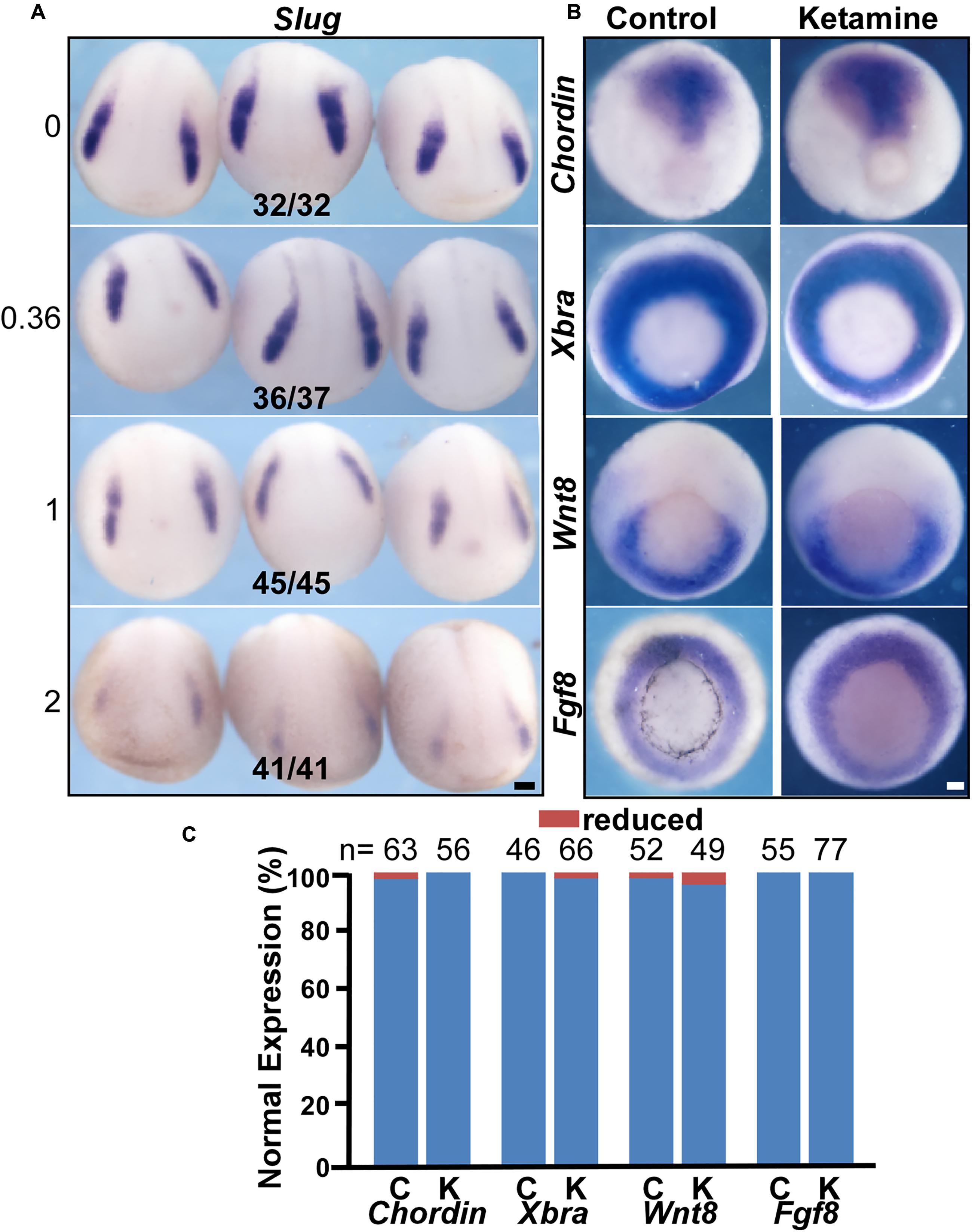 FIGURE 2. Ketamine blocks NC induction independent of mesoderm genesis. (A) The expression of the NC marker gene Slug was inhibited by ketamine in a dose-dependent manner. The numbers of embryos showing similar changes in gene expression and total embryos in each concentration group are indicated. (B) Early mesoderm development is not affected upon ketamine exposure. There were no significant differences in the expression pattern of mesoderm marker genes chordin, Xbra, Wnt8, and Fgf8 between control and ketamine-treated group prior to NC induction. (C) Quantitative analysis of gene expression patterns between control and ketamine group. Scale bar: 100 μm. |