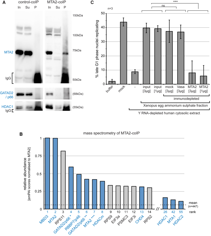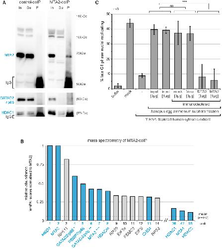 Figure 3. The Xenopus NuRD Complex Has DNA Replication Initiation ActivityNuRD was immunoprecipitated with MTA2-specific antibodies from the 20%–45% ammonium sulfate fraction of the activated Xenopus laevis egg extract.(A) Co-immunoprecipitation of GATAD2/p66 and HDAC1 subunits with MTA2, as confirmed by western blotting. Input (In), supernatant (Su), and washed pellet (P) of the control and MTA2 coIPs are shown, 10% of the total was loaded per lane for each.(B) Mass spectrometry analysis of co-immunoprecipitated material. Xenopus proteins (n = 447) uniquely identified only in the immunoprecipitate and not in the control IP were ranked according to their quantitative emPAI values after normalization to emPAI (MTA2) = 1. The top 14 most abundant proteins are plotted together with additional NuRD subunits. NuRD subunits are shown in blue. The mean normalized emPAI value of all proteins is indicated by a dashed line. Separate and additional isoforms were identified in the Uniprot database for GATAD2/p66 (∗LOC398154; ∗∗LOC100158394, isoform X2) and MTA2 (∗∗∗MGC83056), respectively.(C) Immunodepletion. xNuRD was co-immunoprecipitated with MTA2-specific antibodies as indicated above. Control immunoprecipitations were performed with either empty beads (mock) or with antibodies specific for Drosophila Vasa protein. The indicated protein amounts of immunodepleted supernatants were added to Y RNA-depleted DNA replication initiation reactions. Mean values ± SD of percentages of replicating template nuclei are plotted from n = 3 independent experiments. Brackets indicate results of t tests (unpaired, two-tailed with unequal variance) of experimental and control samples against the untreated input samples (ns, not significant; ∗∗∗p ≤ 0.001).See also Table S2. |