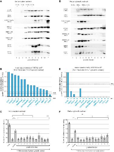 Figure 4. Human NuRD Complexes Are Structurally and Functionally Distinct from xNuRD(A–F) Proliferating human HeLa cells were fractionated into nuclear (A–C) and cytosolic extracts (D–F), and each extract was partially sub-fractionated by precipitation with 20%–45% ammonium sulfate and ultracentrifugation through preparative sucrose gradients.(A and D) Western blot analyses of human NuRD subunits. Fractions of the preparative sucrose gradients of nuclear (A) and cytosolic extracts (D) were analyzed by western blotting with antibodies specific for the indicated human NuRD subunits.(B and E) Mass spectrometry analysis of the MTA2 co-immunoprecipitations. Fractions 6–8 of the preparative sucrose gradients of nuclear (B) and cytosolic extracts (E) were pooled, and human NuRD was immunoprecipitated with anti-MTA2 antibodies. Human proteins identified in the immunoprecipitates (n = 126 and n = 183 for nuclear and cytosolic extracts, respectively) were ranked according to their quantitative emPAI values after normalization to emPAI (MTA2) = 1, and all human NuRD subunits detected are plotted with their rank. The mean normalized emPAI values of all proteins are indicated by dashed lines.(C and F) Activity profiles of the sucrose fractions. Template nuclei were incubated in Y RNA-depleted human cytosolic extract supplemented with the indicated gradient fractions of the nuclear (C) and cytosolic extracts (F). Mean values ± SD of percentages of replicating template nuclei are plotted of n independent experiments. Brackets indicate results of t tests (unpaired, two-tailed with unequal variance) of the positive control (xNuRD) and experimental samples against the Y RNA-depleted background (∗∗∗p ≤ 0.001).See also Figures S2 and S3 and Table S3. |