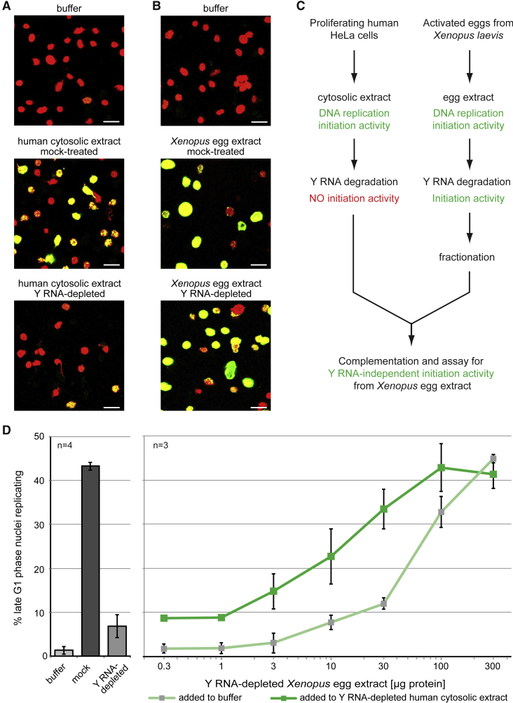 Figure 1. Y RNA-Independent Initiation Activity in Xenopus Egg Extracts(A) Y RNA-dependent initiation of DNA replication in a human cell-free system. Human late G1 phase template nuclei were incubated in either buffer (top) or mock-treated or Y RNA-depleted cytosolic extracts.(B) Y RNA-independent initiation of DNA replication in Xenopus egg extracts. Human late G1 phase template nuclei were incubated in either buffer (top) or mock-treated or Y RNA-depleted Xenopus egg extracts. Representative immunofluorescence micrographs are shown with merged channels for total DNA (propidium iodide, red) or sites of DNA replication (digoxigenin-deoxyuridine triphosphate [dUTP] incorporation, green).(C) Experimental design for the detection and isolation of the initiation activity from Xenopus egg extracts by cross-species complementation assays.(D) Cross-species complementation assays. Left: template nuclei were incubated as in (A) in either buffer or mock-treated cytosolic or Y RNA-depleted human cytosolic extracts. Right: increasing amounts of Y RNA-depleted Xenopus egg extracts were added to replication initiation reactions in the presence of either buffer (light green) or Y RNA-depleted human cytosolic extract (dark green). Percentages of replicating template nuclei for each reaction are shown as mean values ± SD of n independent experiments.Scale bars, 10 μm. |
