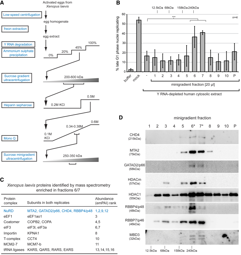 Figure 2. Isolation and Identification of the Y RNA-Independent Initiation Factor from Xenopus Egg Extracts(A) Schematic representation of the fractionation scheme.(B) Activity profile of the sucrose minigradient fractions. Template nuclei were incubated in Y RNA-depleted human cytosolic extract supplemented with the indicated gradient fractions. Percentages of replicating nuclei are shown as mean values ± SD of n = 4 independent fractionation experiments. Brackets indicate results of t tests (unpaired, two-tailed with unequal variance) of experimental samples (fractions 6 and 7) against the control (∗∗∗p ≤ 0.001). Tests of all other fractions against the control were not significant. Sedimentation of calibrator protein complexes (cytochrome c, 12.5 kDa; BSA, 68 kDa; aldolase, 158 kDa; catalase, 240 kDa) are indicated at the top.(C) Proteins in active fractions as identified by mass spectrometry. Proteins identified in both of two independent experimental replicates that were enriched in the active gradient fractions 6/7 compared with inactive fraction 5 are ranked according to their abundance (determined as emPAI scores).(D) NuRD subunit sedimentation profiles. Fractions of the sucrose minigradient were analyzed by western blotting with antibodies specific for the indicated NuRD subunits.See also Figure S1 and Table S1. |