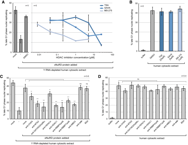 Figure 5. Inhibition of xNuRD Leads to an Inhibition of Y RNA-Independent DNA ReplicationShown is inhibition of DNA replication using HDAC inhibitors and NuRD-specific antibodies.(A) Template nuclei were incubated in Y RNA-depleted human cytosolic extract supplemented with partially purified xNuRD and the indicated concentrations of the HDAC inhibitors trichostatin A (TSA), SAHA, and MS-275.(B) Template nuclei were incubated with human cytosolic extract containing human NuRD and Y RNAs in the presence of the indicated inhibitors.(C) Template nuclei were incubated in Y RNA-depleted human cytosolic extract supplemented with partially purified xNuRD and the indicated NuRD-specific antibodies.(D) Template nuclei were incubated with human cytosolic extract containing human NuRD and Y RNAs in the presence of the indicated NuRD-specific antibodies. Mean values ± SD of the percentages of replicating template nuclei are plotted from n independent experiments. Results of t tests (unpaired, two-tailed with unequal variance) of treated experimental samples against the no addition controls are indicated (∗∗p ≤ 0.01; ∗∗∗p ≤ 0.001). |