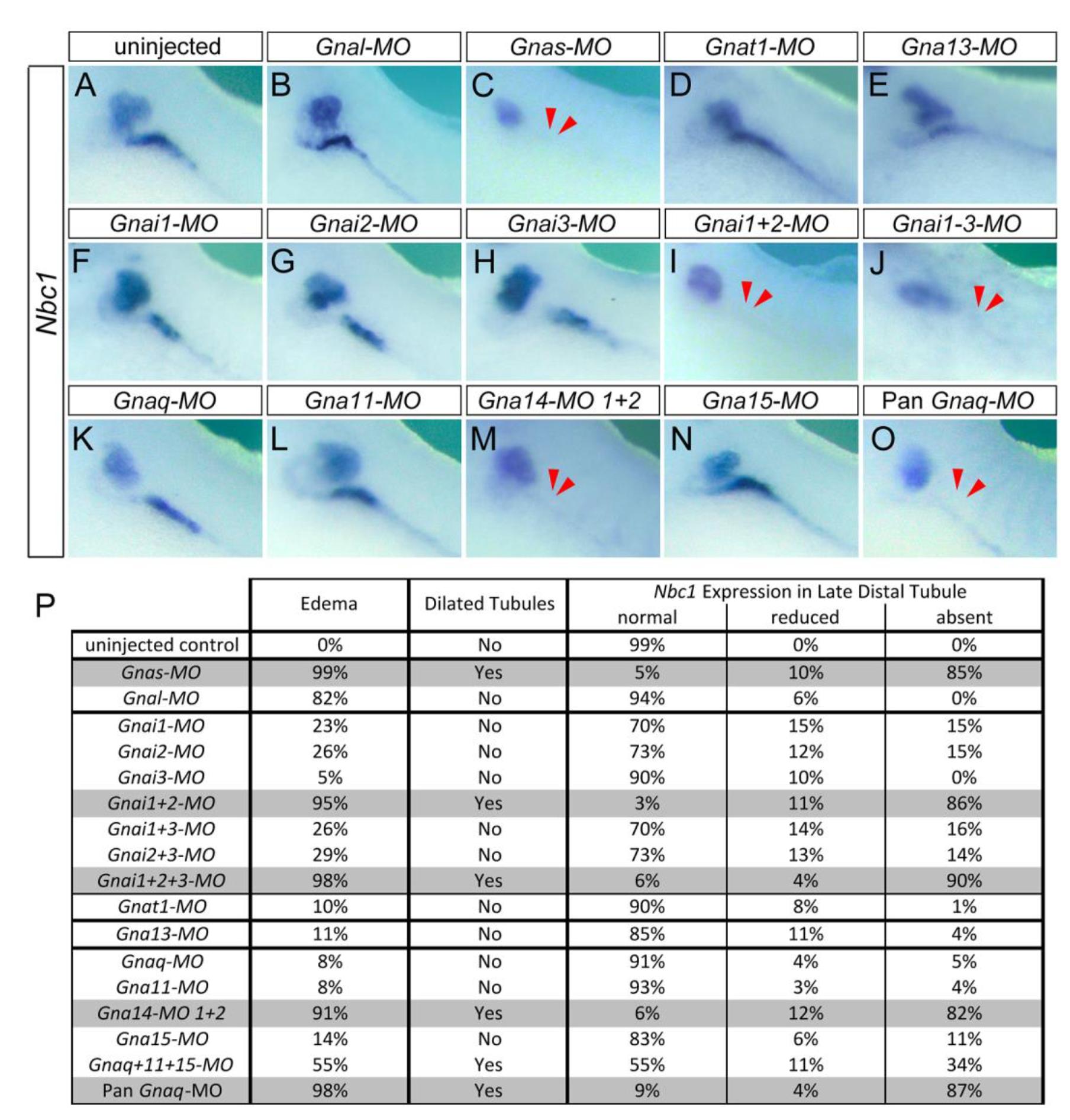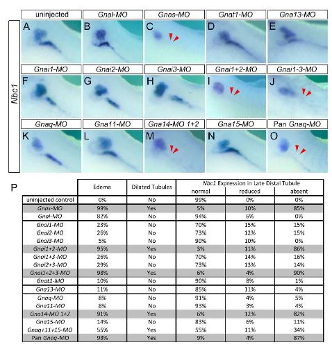 Figure 2: Systematic Analysis of the Knockdown Phenotypes of G-Protein Alpha Subunits and their Interaction with Polycystin-1. (A-O) Whole mount in situ hybridization for Nbc1 expression comparing embryos lacking individual G-protein alpha subunits or combinations thereof. Representative images are shown. Loss-of-Nbc1 expression in the late distal tubule is indicated by red arrowheads. (P) Table summarizing the phenotypes of Xenopus embryos lacking G-protein alpha subunits either individually or in combinations. Morphants with a PKD phenotype are highlighted in gray. Pan Gnaq-MO stands for the knockdown of the entire Gnaq family by simultaneous injection of Gnaq-MO, Gna11-MO, Gna14-MO1+2 and Gna15-MO. The data are presented as percentages of at least three biological replicas. |