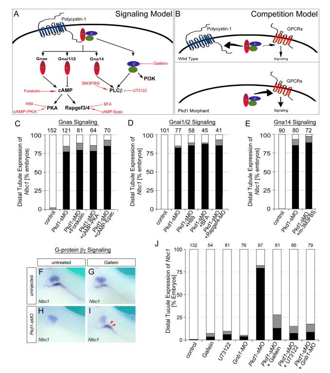 (F-I) Uninjected controls and embryos injected with Pkd1-sMO in the presence or absence of 20 µM gallein were analyzed by Nbc1 whole-mount in situ