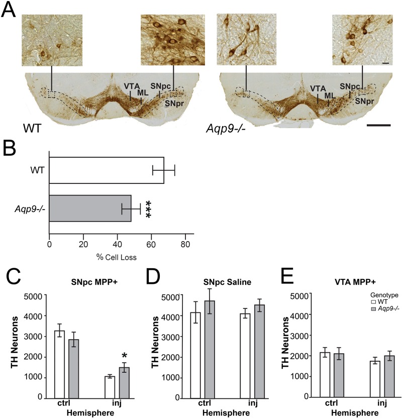 Fig 5. Deletion of Aqp9 protects against MPP+ toxicity in vivo.A) Representative midbrain sections of WT and Aqp9-/- mice, seven days after treatment with unilateral striatal injection of 7.5 μg MPP+. Cell bodies and processes of the dopaminergic neurons are identified by TH immunostaining. The visible reduction of the TH immunostained cell bodies in the ipsilateral SNpc is more pronounced in WT than in Aqp9-/- mice. B) Quantitation of the TH-positive neurons in SNpc is described in the text. TH-positive cell loss, calculated as [(n contra—n ipsi): (n contra)] is significantly lower in Aqp9-/- mice, where 47.59% of the cells are lost, compared to 67.02% in WT littermates (p<0.001). C) Compared with WT mice, Aqp9-/- mice show a significantly higher count of TH-positive neurons on the injected side (p<0.001). D) Animals treated with saline showed no significant loss of TH-positive cells in SNpc, regardless of genotype. E) In WT mice, VTA showed a slight but statistically significant decrease in number of TH-positive neurons on the ipsilateral side (p = 0.033). No change was observed in VTA of Aqp9-/- mice. The MPP+ treated group consisted of 15 animals (Aqp9-/-, n = 8; WT, n = 7), and the saline group consisted of six animals (Aqp9-/-, n = 3; WT, n = 3). ML, medial lemniscus. Bars are mean ± 2 SEM; n = 6; *p<0.05, **p<0.01, ***p<0.001. Scale bar, 1000 μm; scale bar inset, 20 μm. |