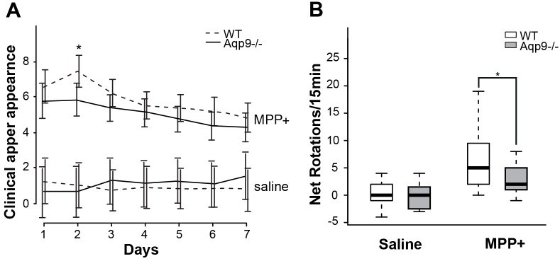 Fig 6. Clinical appearance and behavioral tests of WT and Aqp9-/- with unilateral intrastriatal MPP+ injection.A) Clinical appearance of animals following intrastriatal injections of MPP+ or saline. All animals (MPP+: n = 63; saline: n = 21) were assessed daily on a scale from 1–3 for their clinical appearance, including weight loss, inactivity, and reaction patterns, giving a total score ranging from 0–12 (see Results). Following unilateral striatal treatment with MPP+, both Aqp9-/- and WTs showed a significantly higher score than control animals injected with saline. Aqp9-/- mice treated with MPP+ showed a lower score than the WT littermates throughout the observation period. Statistical analysis of data from individual observations revealed significant difference on day 2. B) Following a systemic injection apomorphine, Aqp9-/- and WT littermates treated with a unilateral striatal injection of 7.5 μg MPP+ tend to spin towards the injected side. Aqp9-/- (n = 26) show significantly less net rotations (ipsilateral—contralateral turns) compared to WTs (n = 27), with a net rotation number of 2.69 ± 1.91 compared to 6.33 ± 2.15 (mean ± 2 SEM; p = 0.014, n = 53). The rotational behavior was not present in animals treated with saline (n = 17).; Boxes are mean ± 95% CI, bars are maximum and minimum values, *p<0.05. |