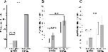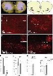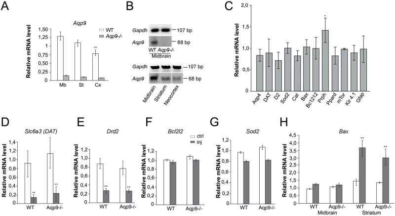 Fig 8. Semiquantitative PCR analyses of gene expression in Aqp9-/- and WT mice brain.A) Semi-quantitative Real-Time PCR revealed significantly higher Aqp9 mRNA levels in the midbrain and striatum than in the neocortex. The level of Aqp9 mRNA in neocortex is 59% of that in midbrain (p = 0.002). The level of Aqp9 mRNA in the Aqp9-/- mice was close to the detection limit (n = 7 for each genotype). B) Representative DNA agarose gel electrophoresis of midbrain samples from WT and Aqp9-/- mice (upper panel), and of three different regions in WT mice (lower panel). These data support the PCR analysis in A. C) In order to rule out that the reduced dopaminergic cell loss in the Aqp9-/- mice could be attributed to compensatory up- or downregulation of other genes, an analysis was done of the expression levels of Aqp4, Gfap, Kir4.1, mTOR, Prph, Cat, Ppard, Slc6a3 (DAT), Drd2, Bcl2, Bax and Sod2. The relative levels of these transcripts did not differ between Aqp9-/- (n = 7) and WT animals (n = 7). D-H). For selected genes the expression levels were analyzed in the treated and untreated hemispheres. In both groups of animal, the transcript levels of Drd2 were lower in the striatum on the injected side than in the striatum on the contralateral side (E). In contrast, in both groups of animals, the level of Bax was higher in the ipsilateral striatum than in the contralateral one (H). The values indicated in the graphs for DAT, Bcl2 and Sod2 show the values for midbrain, and the values for Drd2 are for striatum. All values are relative to the values for the corresponding samples from the control hemisphere of the saline treated mice. Bars are mean ± 2 SEM; **p<0.005. |