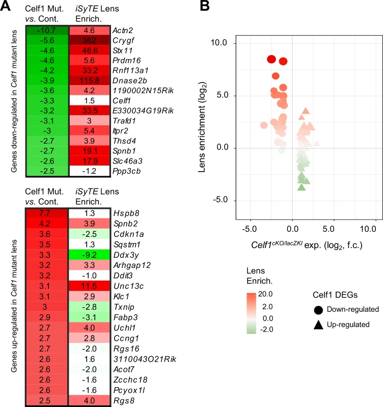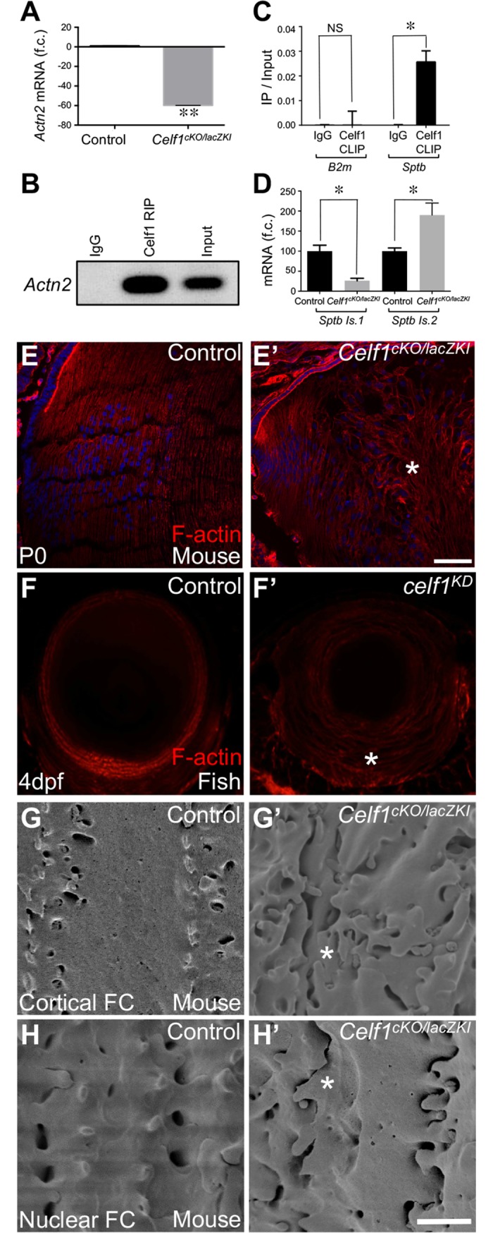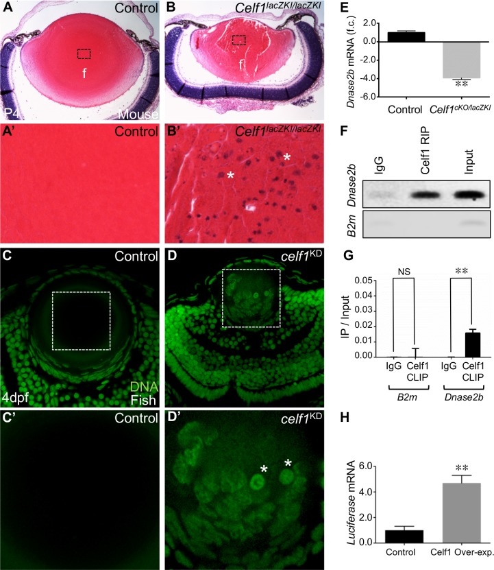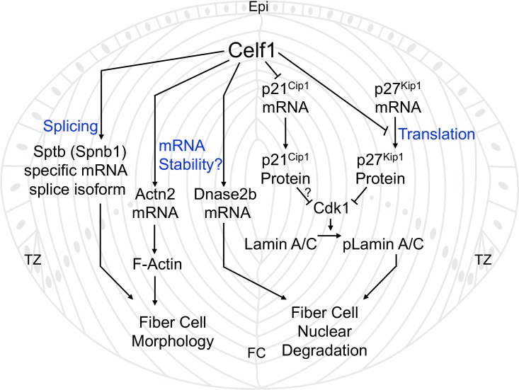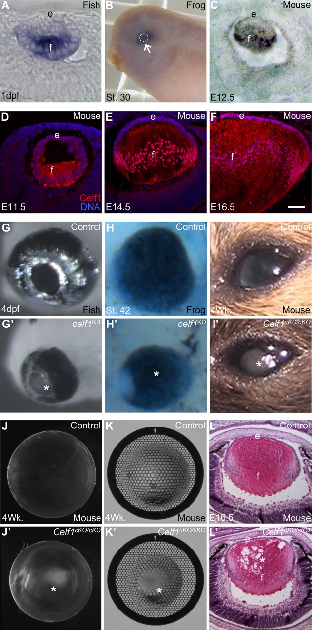 Opacification of the ocular lens, termed cataract, is a common cause of blindness. To become transparent, lens fiber cells undergo degradation of their organelles, including their nuclei, presenting a fundamental question: does signaling/transcription sufficiently explain differentiation of cells progressing toward compromised transcriptional potential? We report that a conserved RNA-binding protein Celf1 post-transcriptionally controls key genes to regulate lens fiber cell differentiation. Celf1-targeted knockout mice and celf1-knockdown zebrafish and Xenopus morphants have severe eye defects/cataract. Celf1 spatiotemporally down-regulates the cyclin-dependent kinase (Cdk) inhibitor p27Kip1 by interacting with its 5' UTR and mediating translation inhibition. Celf1 deficiency causes ectopic up-regulation of p21Cip1. Further, Celf1 directly binds to the mRNA of the nuclease Dnase2b to maintain its high levels. Together these events are necessary for Cdk1-mediated lamin A/C phosphorylation to initiate nuclear envelope breakdown and DNA degradation in fiber cells. Moreover, Celf1 controls alternative splicing of the membrane-organization factor beta-spectrin and regulates F-actin-crosslinking factor Actn2 mRNA levels, thereby controlling fiber cell morphology. Thus, we illustrate new Celf1-regulated molecular mechanisms in lens development, suggesting that post-transcriptional regulatory RNA-binding proteins have evolved conserved functions to control vertebrate oculogenesis.