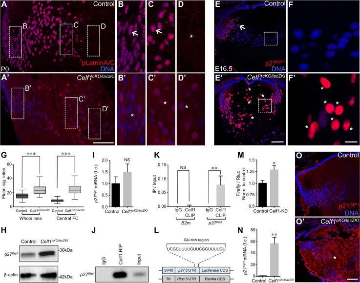 The RNA-binding protein Celf1 post-transcriptionally regulates p27Kip1 and Dnase2b to control fiber cell nuclear degradation in lens development.