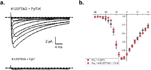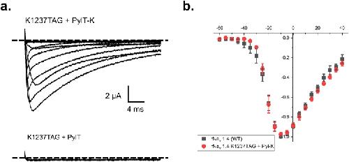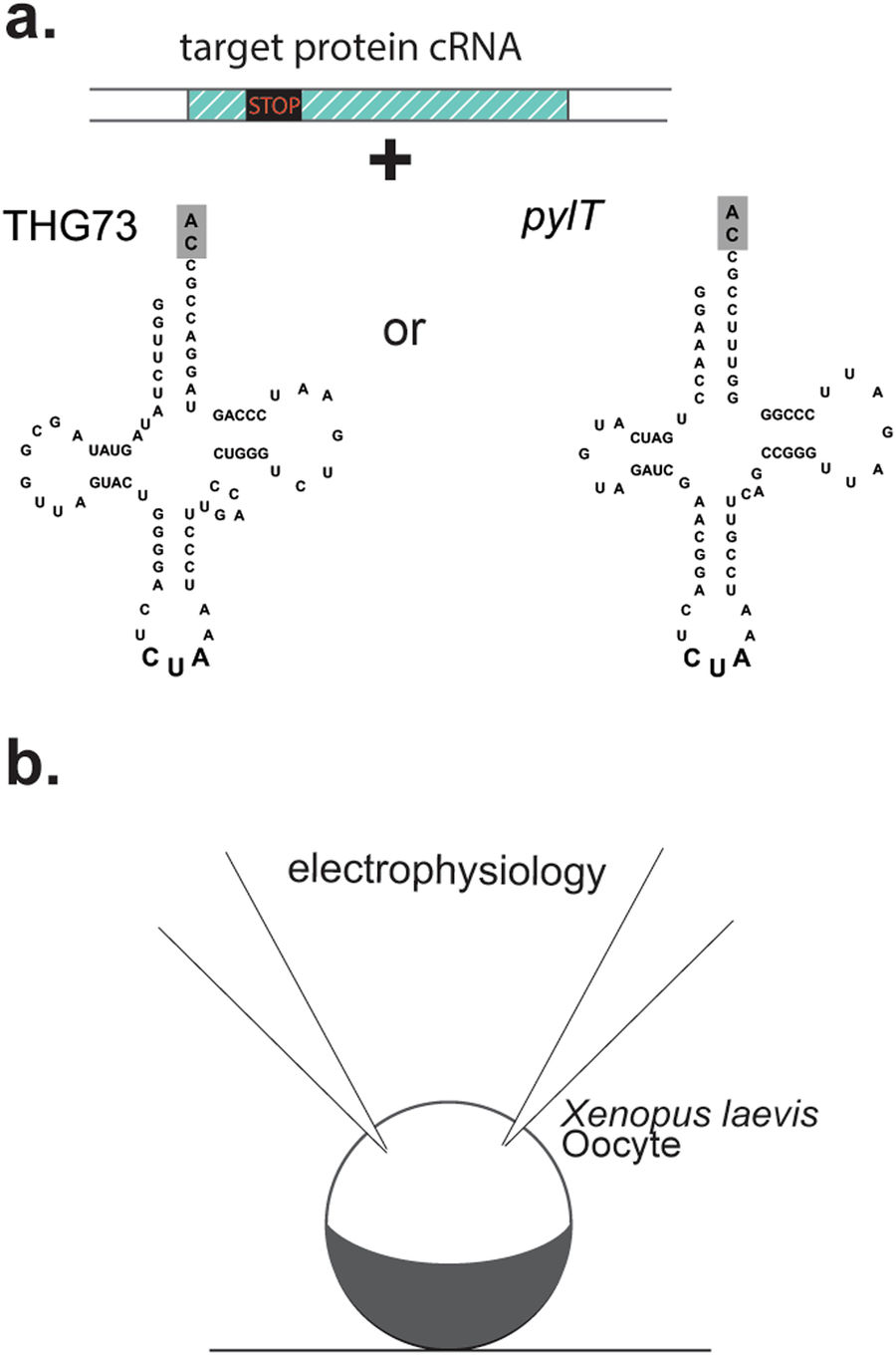 Chemical aminoacylation of orthogonal tRNA allows for the genetic encoding of a wide range of synthetic amino acids without the need to evolve specific aminoacyl-tRNA synthetases. This method, when paired with protein expression in the Xenopus laevis oocyte expression system, can extract atomic scale functional data from a protein structure to advance the study of membrane proteins. The utility of the method depends on the orthogonality of the tRNA species used to deliver the amino acid. Here, we report that the pyrrolysyl tRNA (pylT) from Methanosarcina barkeri fusaro is orthogonal and highly competent for genetic code expansion experiments in the Xenopus oocyte. The data show that pylT is amendable to chemical acylation in vitro; it is then used to rescue a cytoplasmic site within a voltage-gated sodium channel. Further, the high fidelity of the pylT is demonstrated via encoding of lysine within the selectivity filter of the sodium channel, where sodium ion recognition by the distal amine of this side-chain is essential. Thus, pylT is an appropriate tRNA species for delivery of amino acids via nonsense suppression in the Xenopus oocyte. It may prove useful in experimental contexts wherein reacylation of suppressor tRNAs have been observed.