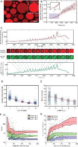 (A) Fluorescence image of securin-mCherry, a reporter for the cell cycle oscillator, in micro-emulsion droplets (scale bar, 100 µm). One example droplet (inside the white dotted framed square) is selected for time course analysis in Figure 2B. (B) The time course of securin-mCherry fluorescence intensity of the selected droplet from Figure 2A, indicating 32 undamped oscillations over a course of 100 hr. (C) Simultaneous measurements of fluorescence intensities of securin-mCherry (upper panel) and cyclin B-YFP (lower panel), showing sustained oscillations for about 58 hr. The mRNA concentrations of securin-mCherry and cyclin B-YFP are 10 ng/µL and 1 ng/µL. The series of mCherry and YFP images correspond to selected peaks and troughs in the time courses of fluorescence intensities. The two channels have coincident peaks and troughs for all cycles, suggesting that they both are reliable reporters for the cell cycle oscillator. (D, E) The oscillator is tunable in frequency (D) and number of cycles (E) as a function of the concentration of cyclin B mRNAs. Cyclin B not only functions as a substrate of APC/C but also binds to Cdk1 for its activation, functioning as an ‘input’ of the clock. In Figure 2D, the cell cycle periods are shortened by increasing the mRNA concentrations. In Figure 2E, the number of total cell cycles is reduced in response to increasing cyclin B mRNA concentrations. Each data point represents a single droplet that was collected from one of the loading replicates (see Materials and methods 7). Red dashed line connects medians at different conditions. Error bar indicates median absolute deviation (MAD). (F, G) Droplets with smaller diameters have larger periods on average and a wider distribution of periods (F), and exhibit smaller number of oscillations on average (G). Colored areas represent moving 25 percentiles to 75 percentiles and is smoothed using the LOWESS smoothing method (see Materials and methods 7). The equivalent diameter is defined as the diameter of a sphere that has an equal volume to that of a droplet, estimated by a volume formula in literature (Good et al., 2013). Note that these size effects are smaller for droplets with higher cyclin B mRNA concentrations. |