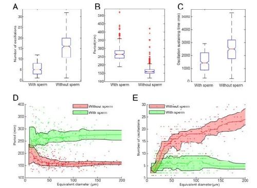 Author response image 1. A-C Statistics of droplets with sperm DNA (N=320) and without sperm DNA (N=373).All droplets were prepared in the same day from the same batch of frog eggs. The figures show that adding sperm DNA may cause significant difference in number of oscillations (A), period (B) and oscillation sustaining time (C). D-E. Droplet-size dependence of period (D) and number of oscillations (E) with nucleus effect, showing that adding sperm DNAs has a more significant impact on larger droplets. |