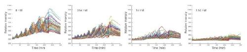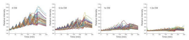 Author response image 6. Time traces of individual droplets with different concentrations of energy mix.Each condition has two duplicate experiments and only one is shown. It is evident that the amplitude, baseline, and period decrease as the level of energy mix increases. |