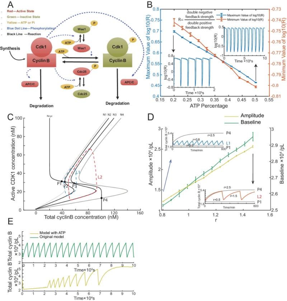 (A) Schematic view of the cyclin B-Cdk1 oscillation system. Note that ATP is taken into consideration. Activated molecules are marked in red, inactivated molecules in green and ATP or Pi in yellow. Black line indicates a reaction and blue dotted line a phosphorylation. (B) Relationship between ATP percentage and R value, showing that decreasing the ATP concentration leads to a higher R value. Error bars represent ranges from three simulations. Two inserts represent the dynamics of R value over time when the ATP percentage [ATP]/([ATP]+[ADP]) is set as 0.2 (left) and 0.5 (right). The model is simulated using Gillespie algorithm. (C) Phase plots of the two-ODE model. Parameters for the cyclin B nullcline (Ncyc) (Yang and Ferrell, 2013) and the Cdk1 nullclines with a variety of values of r (N1, r = 0.5; N2, r = 0.8; N3, r = 1.5; N4, r = 2.5) were chosen based on previous experimental work (Pomerening et al., 2003; Sha et al., 2003). Note that the r here is a parameter and is different from R in Figure 3B. Two sample traces of limit cycle oscillations are plotted for r = 0.8 (L1) and r = 1.5 (L2), showing that a larger r value leads to a higher amplitude and baseline. In addition, r = 0.5 (N1) generates a low stable steady-state of cyclin B (P1), while r = 2.5 (N4) a high stable steady-state of cyclin B (P4). These stable steady-states are indicated by the intersections of the nullclines (filled circles). The unstable steady states are labeled with open circles (P2 and P3). (D) Relationship between the oscillation baseline and amplitude values and ATP concentration (positively correlated with r). Error bars indicate the ranges of 3 replicates. Inserts show two example time courses of total cyclin B with different r values (L1, r = 0.8; L2, r = 1.5), colors of which match the ones in Figure 3C. Simulation is done using Gillespie algorithm. (E) Time series of total cyclin B molecules from the model without ATP (top panel, green line) and with ATP (bottom panel, yellow line). |