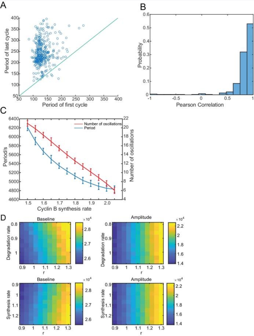 (A) The period of the first cycle vs the last cycle in a droplet, showing that the period of the last cycle tends to be longer. Blue line indicates the same first and last periods. (B) Pearson correlation between the period of cycle and the index of cycle in a droplet. Positive correlation indicates that the cell cycle period tends to increase over time. (C) The period and number of oscillations decrease with an increasing cyclin B synthesis rate. Error bars represent standard deviations from 50 simulations. (D) Effects of synthesis and degradation rates of cyclin B as well as r on the baseline and amplitude of oscillations of total cyclin B. Color bar indicates baseline or amplitude of cyclin B (number of molecules per pL). |