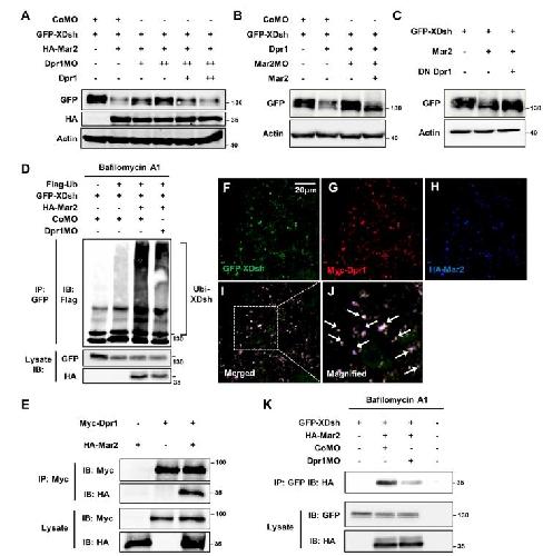 Fig. 6. March2 interacts with Dapper1 for Dsh degradation. (A) Dpr1MO impairs the March2-mediated decrease of Dsh protein. Four-cell stage embryos were dorso-animally injected with the indicated reagents and analyzed at stage 12. Amounts of injected mRNAs and MOs: GFP-XDsh, 200 pg; HA-Mar2, 1 ng; CoMO, 40 ng; Dpr1MO, 20 (+) and 40 ng (++); Dpr1, 1 (+) and 2 ng (++). (B) Mar2MO inhibits the Dpr1-mediated decrease in Dsh. Amounts of injected mRNAs and MOs: GFP-XDsh, 200 pg; Mar2, 1 ng; CoMO and Mar2MO, 40 ng; Dpr1, 2 ng. (C) The dominant-negative (DN) form of Dpr1 inhibits the March2-mediated decrease of Dsh. Amounts of injected mRNAs: GFP-Dsh, 200 pg; Mar2, 1 ng; DN Dpr1, 2 ng. (D) In vivo ubiquitylation assays showing that Dpr1MO (40 ng) reduces Mar2-mediated poly-ubiquitylation of Dsh. (E) Co-immunoprecipitation analysis showing that March2 binds Dpr1 in HEK293 T cells. (F-J) Dsh, Dpr1 and March2 are colocalized in Xenopus. Animal caps injected with GFP-XDsh (250 pg), Myc-Dpr1 (250 pg) and HA-Mar2 (250 pg) mRNAs were analyzed. White arrows (J) indicate Dsh-Dpr1-Mar2 colocalized puncta. (K) Co-immunoprecipitation analysis in Xenopus embryos showing Dpr1MO weakens the binding affinity between Mar2 and Dsh. Amounts of injected mRNAs and MOs: GFP-XDsh, 1 ng; HA-Mar2,1 ng; CoMO and Dpr1MO, 40 ng.